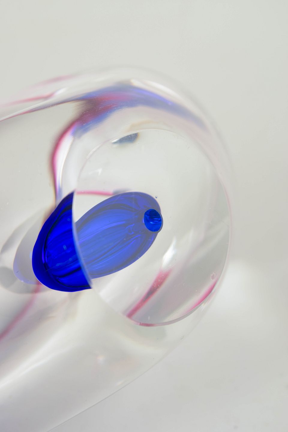 Organisk formet skål i mundblæst kunstglas med lagdelt sommerso-teknik. Klar glasmasse med indkapslede farvefelter i blå og rosa, der skaber dybde og et karakteristisk svævende farvespil. Typisk Murano-arbejde fra 1960’erne/70’erne med bløde, skulpturelle linjer.