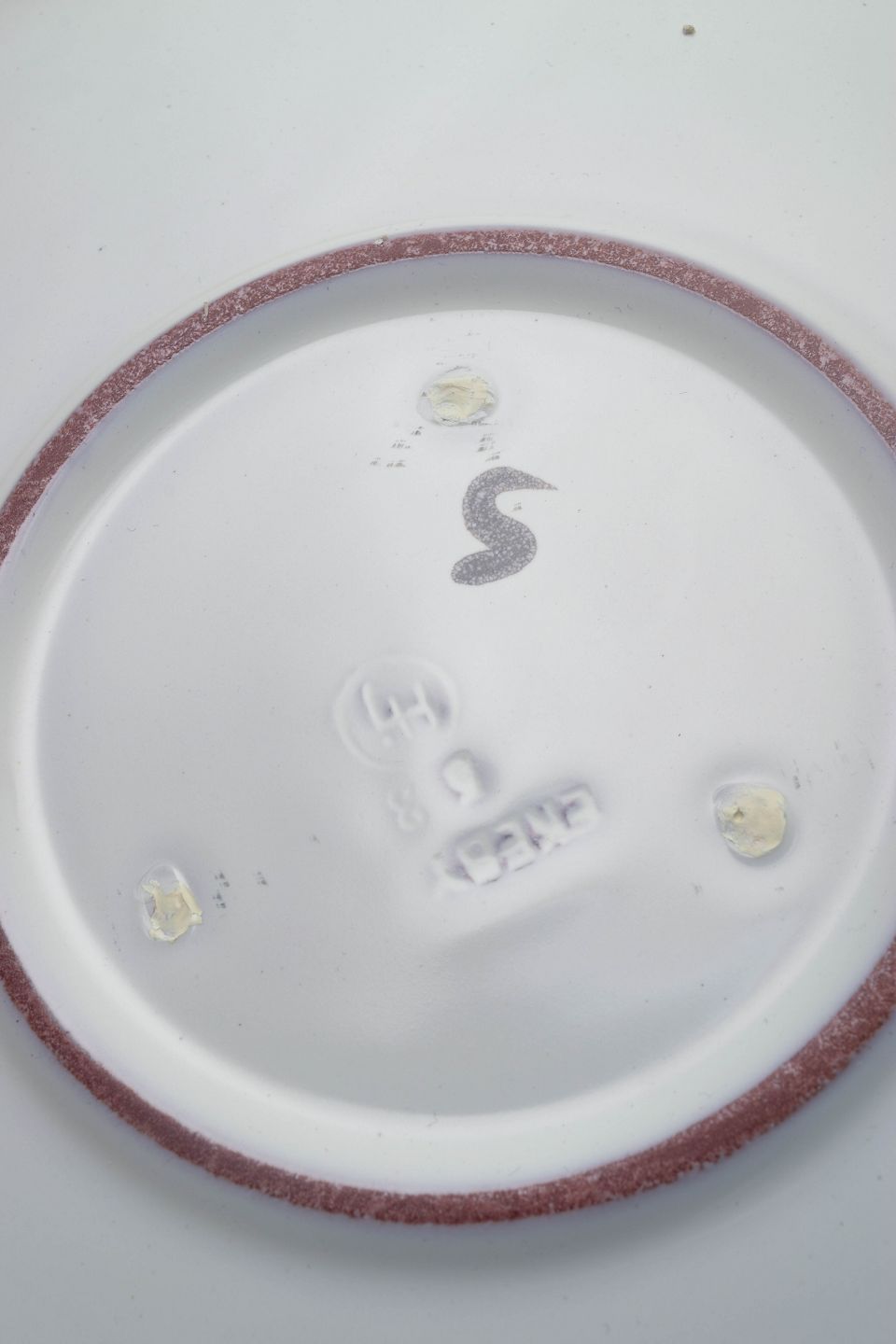 Dekorativt fad i glaseret keramik med grafisk spiralornamentik i grågrønne nuancer og rød kant. Modellen fremstår med et stramt, tidstypisk formsprog fra 1930/40’ernes svenske modernisme og er angivet som model 53.