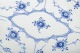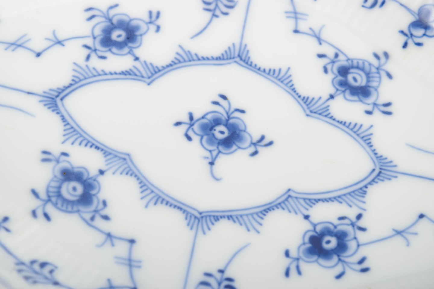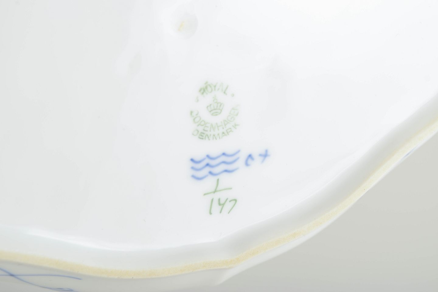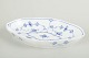 Ovalt porcelænsfad dekoreret med håndmalet koboltblåt underglasur i det klassiske Musselmalet Riflet mønster. Modellen er 1/147 og kendetegnes ved den let facetterede, blødt svungne form med profileret rand og opdelt spejl, rigt udsmykket med blomster- og rankemotiver. Et elegant eksempel på Royal Copenhagens forfinede porcelænskunst fra mellemkrigstiden.