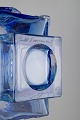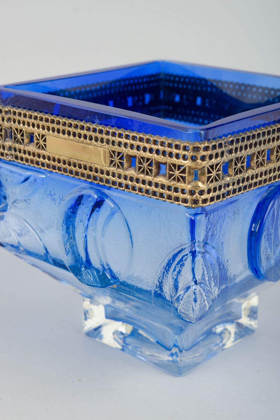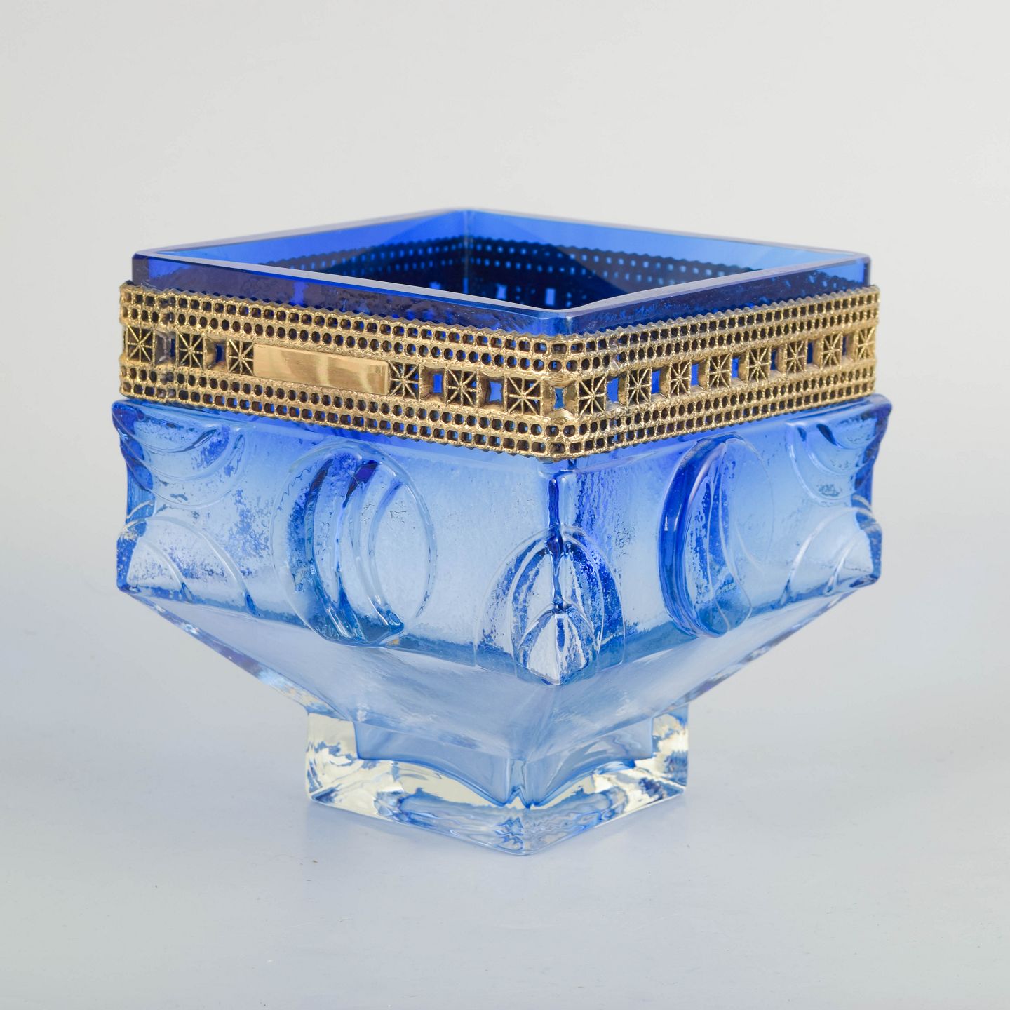 Kraftig glasskål i blåtonet formstøbt glas med geometrisk relief og påsat metalmontering langs kanten. Skålen er håndsigneret og fremstår som et markant eksempel på finsk design fra perioden.