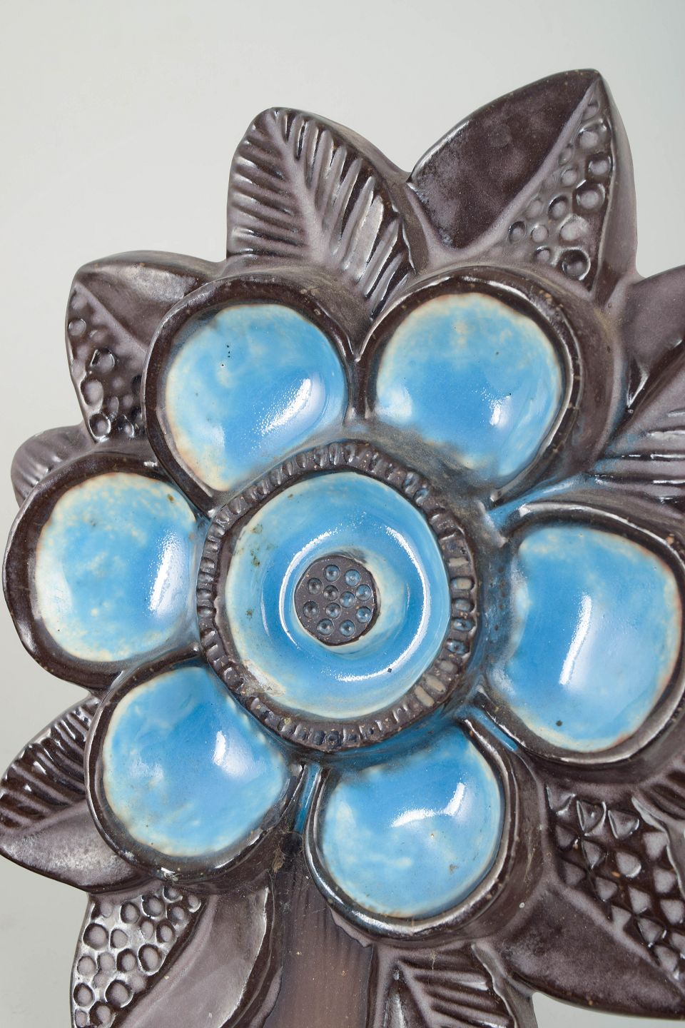 Dekorativt vægrelief i glaseret keramik formet som stiliseret blomst med bladmotiv. Relieffet er udført i brune toner med kontrasterende lyseblå, blankglaserede felter, der giver et markant og plastisk udtryk. Overfladen kombinerer relief, rytme og farvespil i et klart modernistisk formsprog. Modelnummer 1071.