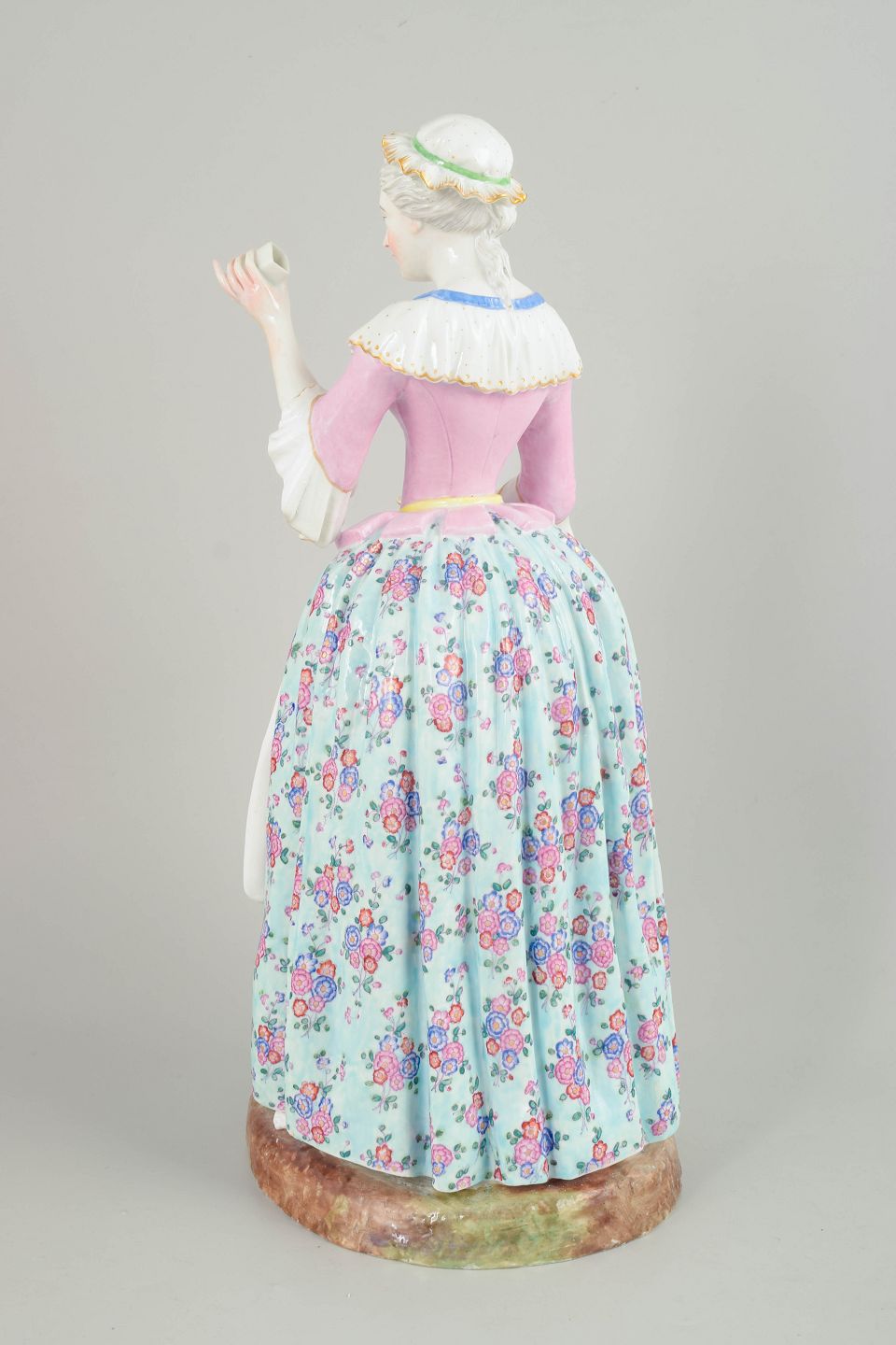 Stor Meissen porcelænsfigur fremstillet efter Jean-Étienne Liotards berømte motiv “La Belle Chocolatière” (1744). Figuren forestiller en kvinde i 1700-talsdragt med serveringsbakke og kop, rigt bemalet med polykrome blomsterdekorationer, fine ansigtstræk og detaljeret staffering. Udført efter model nr. 1471 og forsynet med Marcolini-mærke, dateret til ca. 1790’erne.