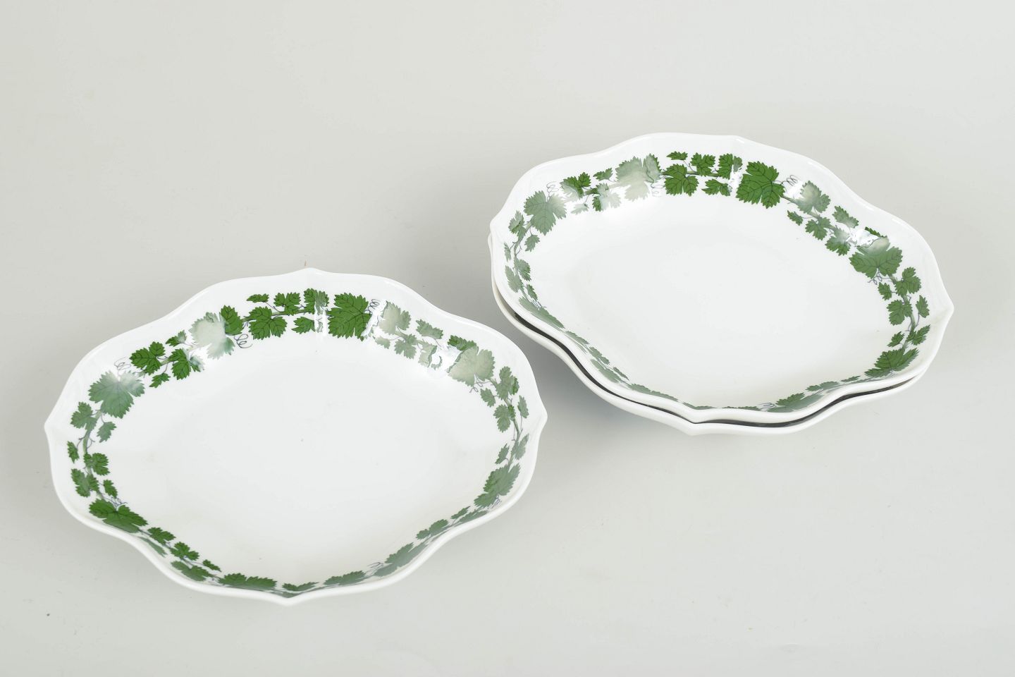 Sæt bestående af tre små serveringsfade i porcelæn med grøn vinranke- og vinløvsdekoration langs fanen; fra den grønne vinløvsserie.