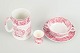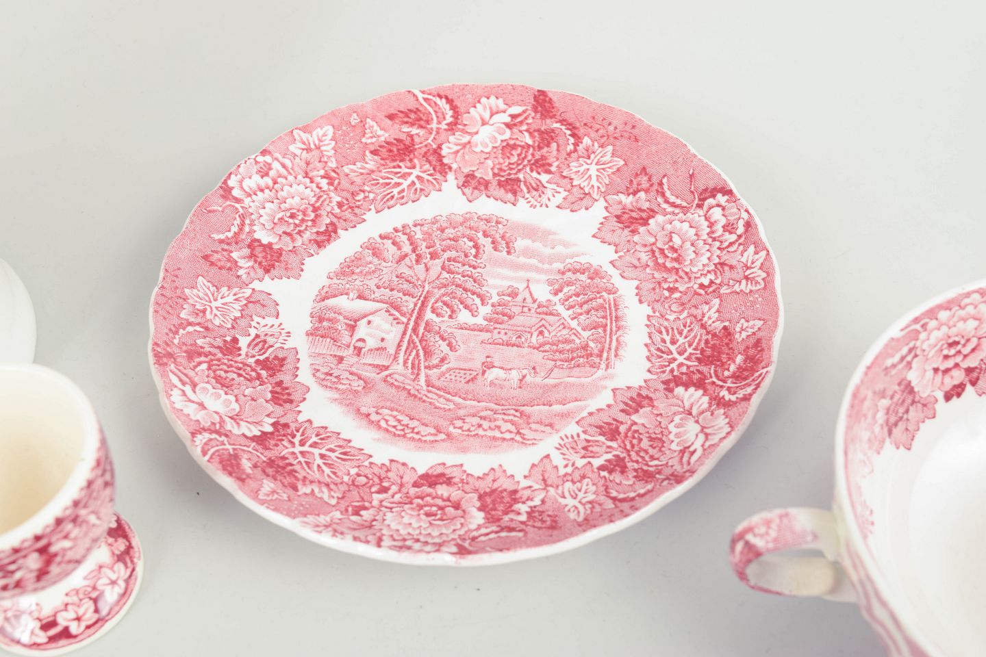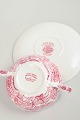 Sæt i fajance fra Mason’s / Wood & Sons, dekoreret i rød transferware med landskabs- og ornamentmotiver.