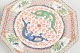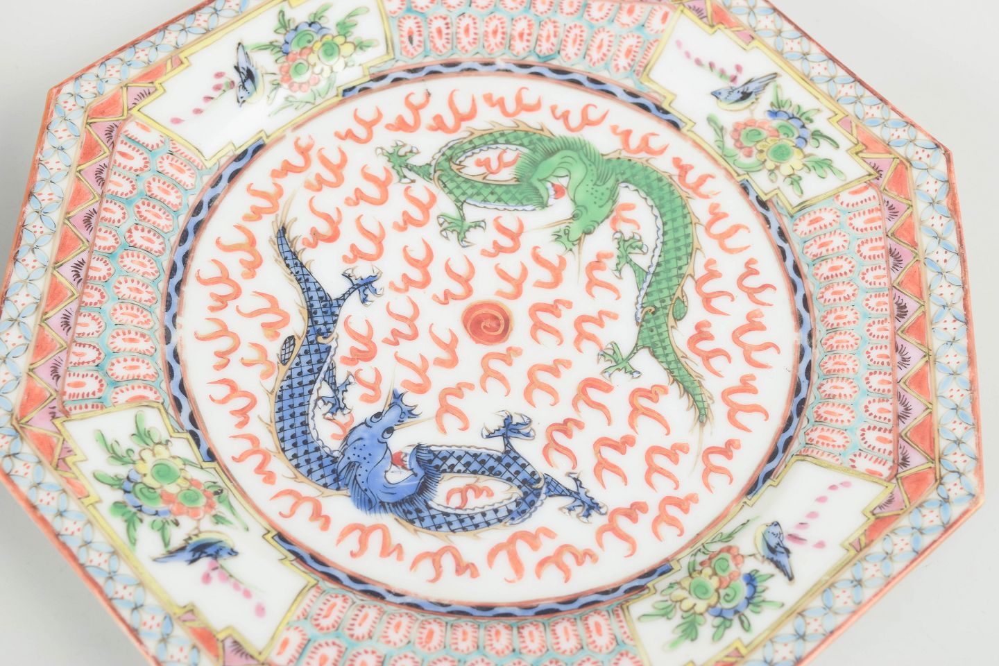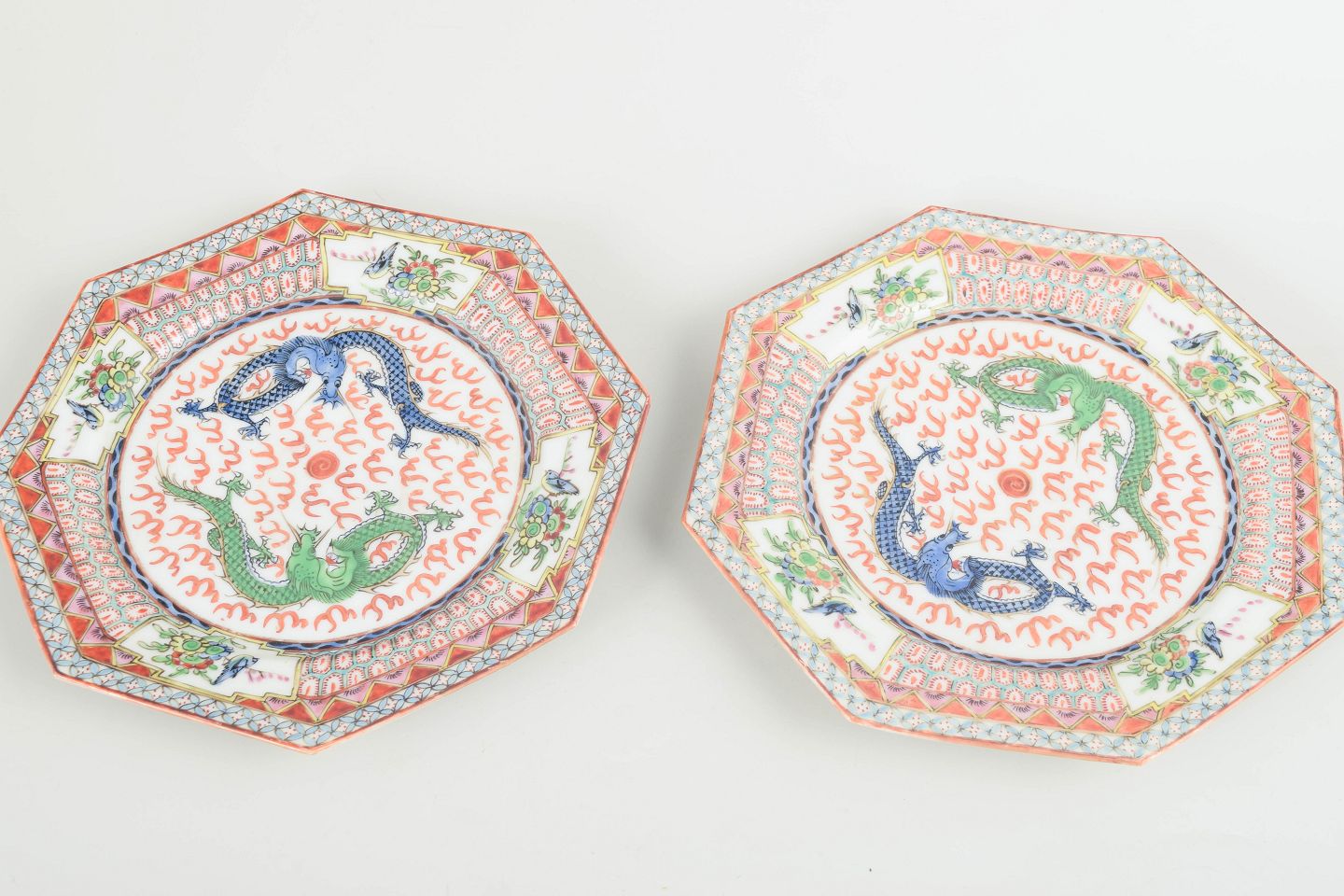 Ottekantede tallerkener i håndmalet porcelæn med polykrom dekoration af drager og stiliserede mønstre i jernrøde, grønne og blå toner, indrammet af geometriske og florale borter. Udført til eksportmarkedet.