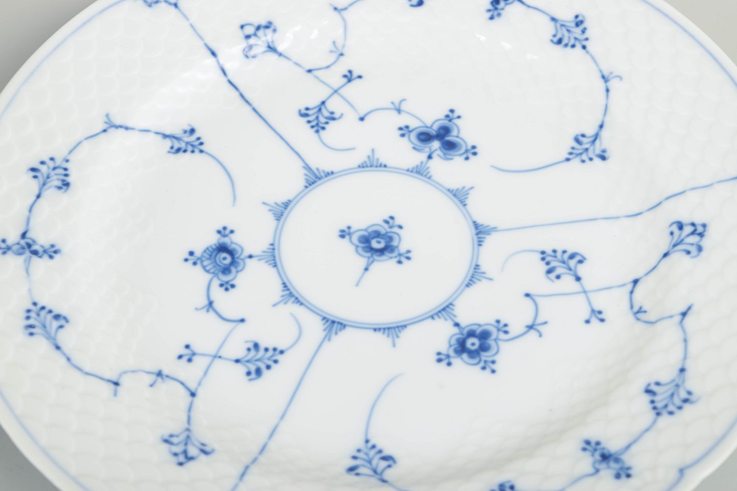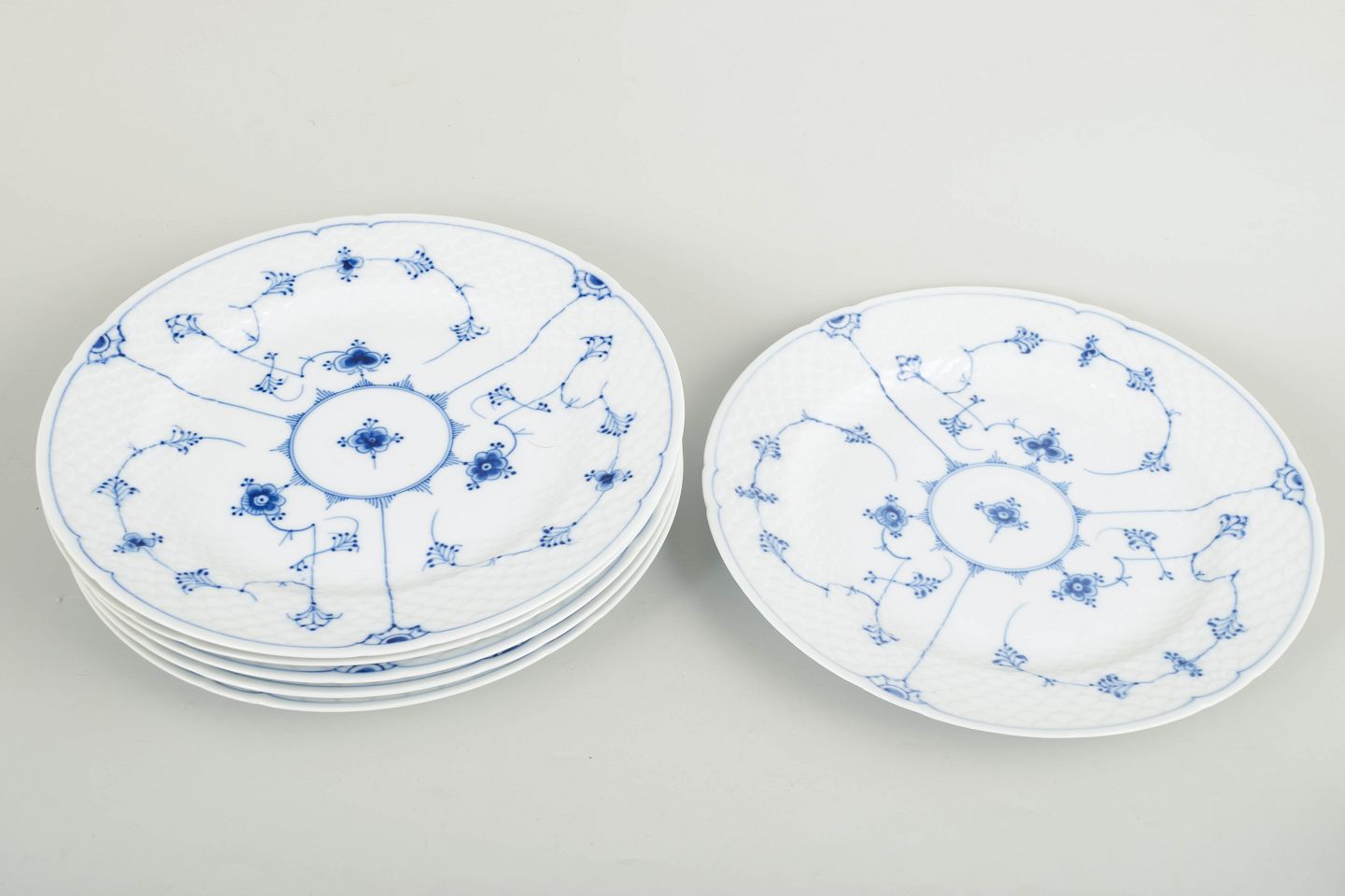 Royal Copenhagen Musselmalet Riflet, sæt af seks middagstallerkener.