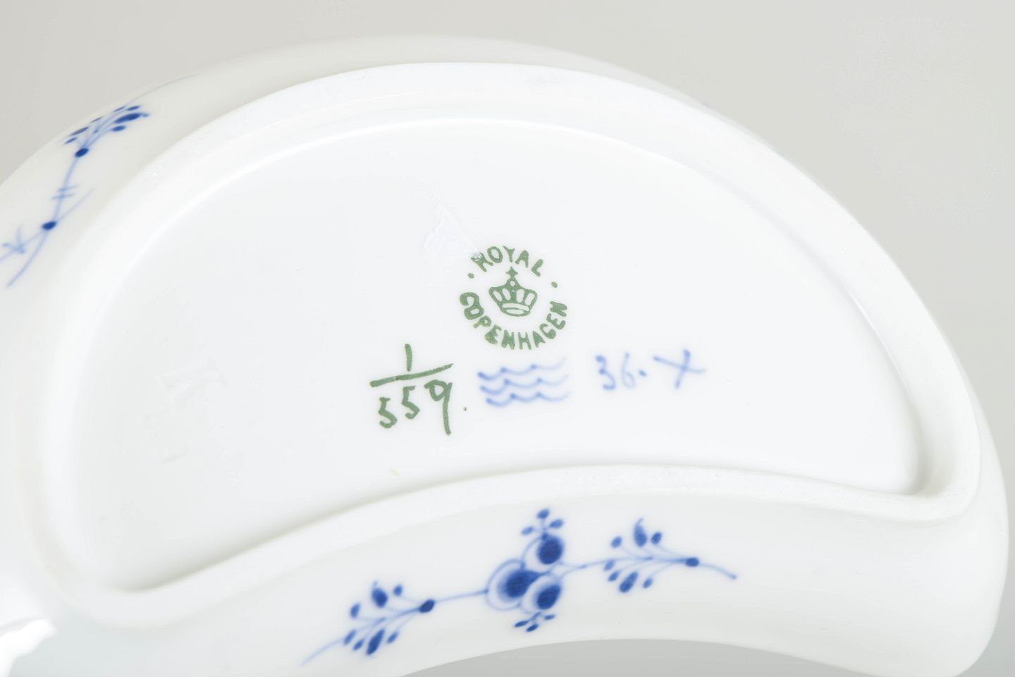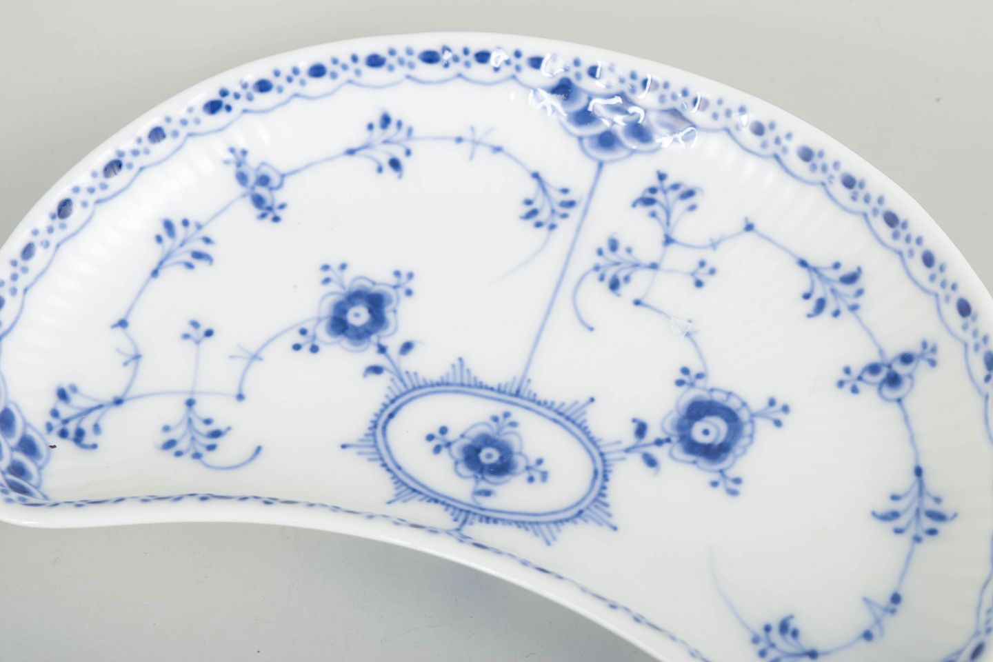 Halvmåneformet fad i håndmalet porcelæn fra Musselmalet Halvblonde med klassisk underglasurdekoration i koboltblå, riflede felter og karakteristisk blondekant. Model 1/559. Første sortering. Fremstillet i 1920’erne.