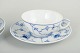 Sæt af tre tekopper i håndmalet porcelæn fra Musselmalet Riflet med klassisk underglasurdekoration i koboltblå. Model 1/76. Fremstillet i 1920’erne. Nogle dele er første sortering, andre annulleret med én eller to indridsede streger under bunden.