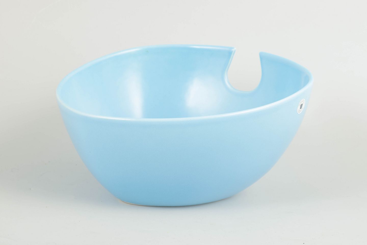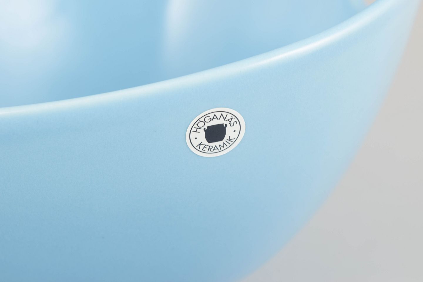 Stor salatskål i stentøj med lyseblå glasur og karakteristisk tud i kanten. Stemplet Höganäs Keramik Made in Sweden.