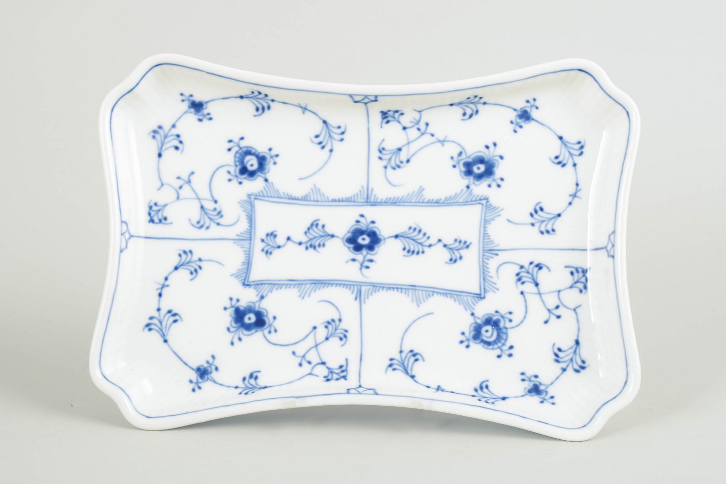 Bakke i håndmalet porcelæn fra Musselmalet Riflet med klassisk underglasurdekoration i koboltblå og riflede felter. Model 1/269. H. 16 cm, D. 24 cm. Annulleret med én indridset streg under bunden. Fremstillet i 1965.