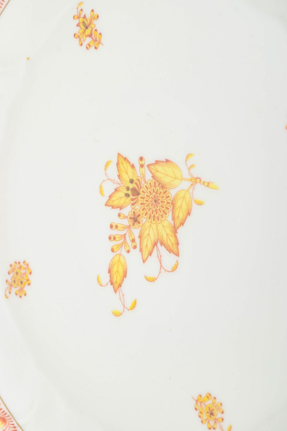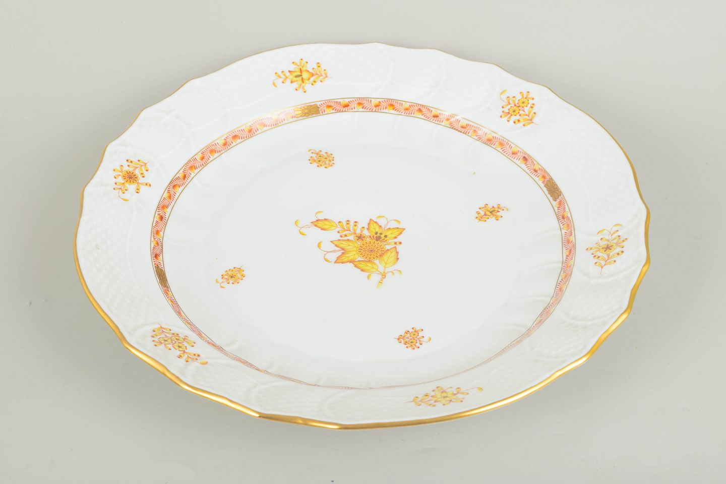 Impressive and generously sized porcelain platter from Herend decorated in the Chinese Bouquet pattern, featuring a central floral bouquet in warm golden tones, surrounded by delicate scattered floral motifs and an elegant gilded rim. The gently scalloped edge and subtle relief structure enhance its classical and harmonious appearance. A striking serving piece from the mid-20th century with distinguished hand-painted decoration.
