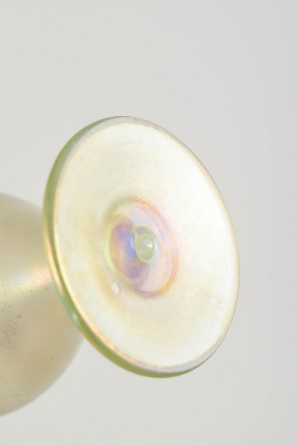 Dekorativ vase i mundblæst glas med mat, let opaliserende overflade i grønlig tone og iriserende, floralt slyngende dekoration i gyldne og rosa nuancer. Den balusterformede krop med cylindrisk hals og rund fod er karakteristisk for Loetz’ produktion i mellemkrigstiden, hvor klassiske former blev kombineret med raffinerede overfladeeffekter.