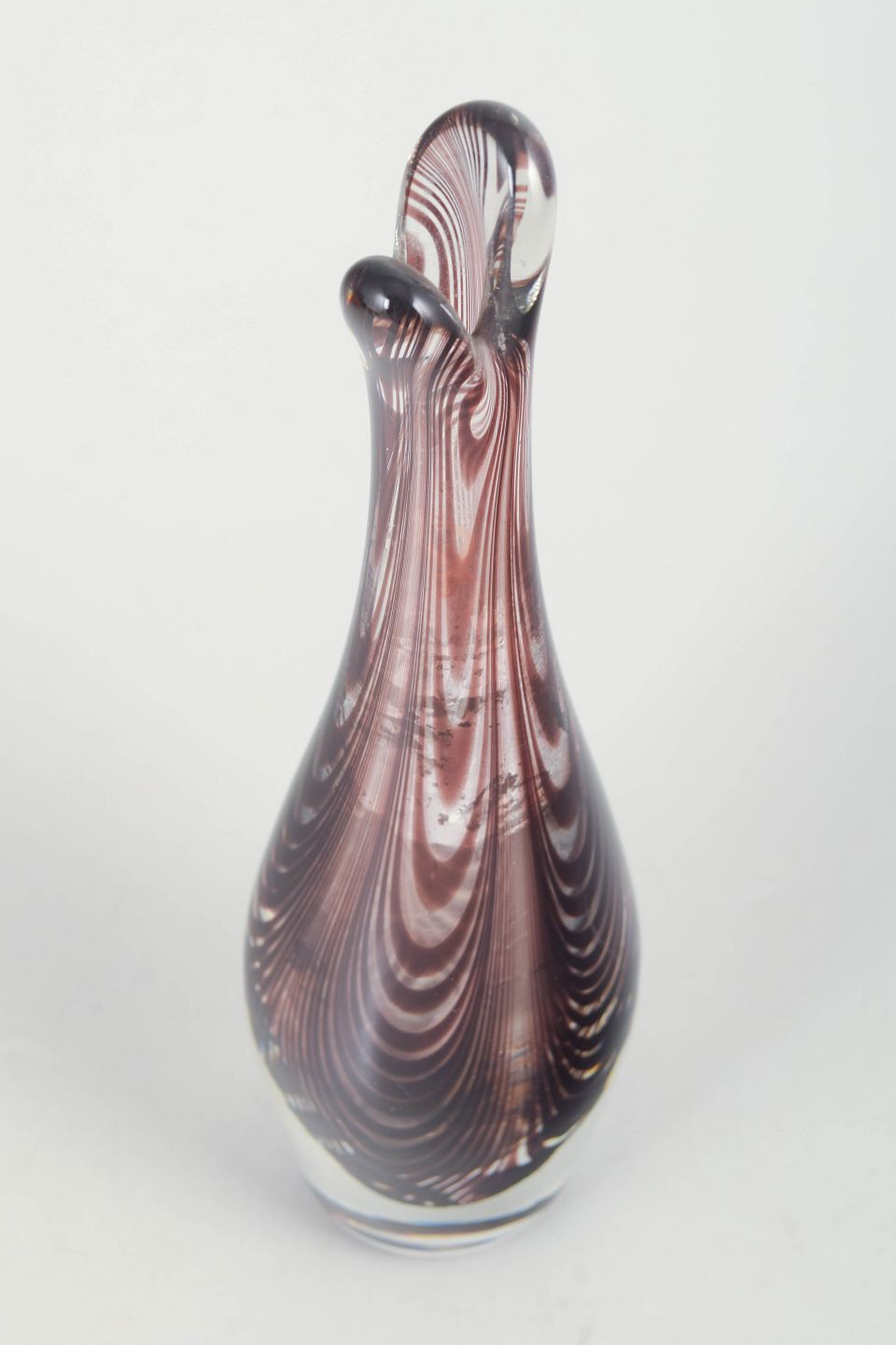 Dekorativ kunstglasvase i flerfarvet glas med spiralformede hvide tråde og bølgende åbning, udført i karakteristisk Murano-stil med skulpturel form.