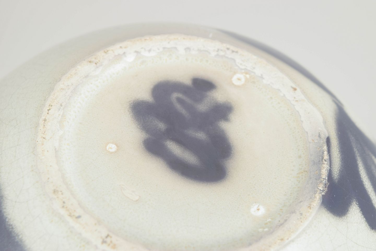 Organisk formet vase i keramik med blød, rund korpus og håndmalet dekoration i blåviolette nuancer på lys bund. Signeret EB under bunden.