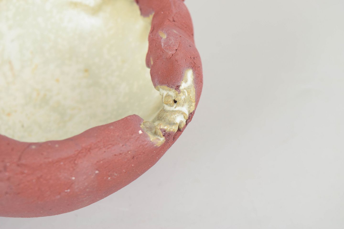 Lille unika skål i rødt stentøjsler på fod. Uglaseret på ydersiden fremstår den med det røde, varme ler som en kontrast til den cremehvide matte krystalglasur der optræder indvendigt.