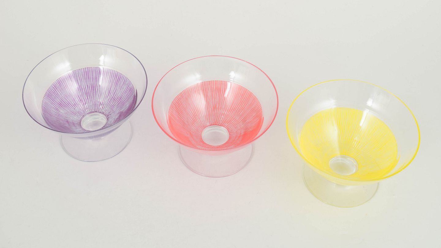 Elegante glas i klart glas med fine indfarvede ribbede strukturer i lilla, rosa og gul. Lette og dekorative former fra 1960’erne, velegnede som både cocktailglas og dessertskåle.