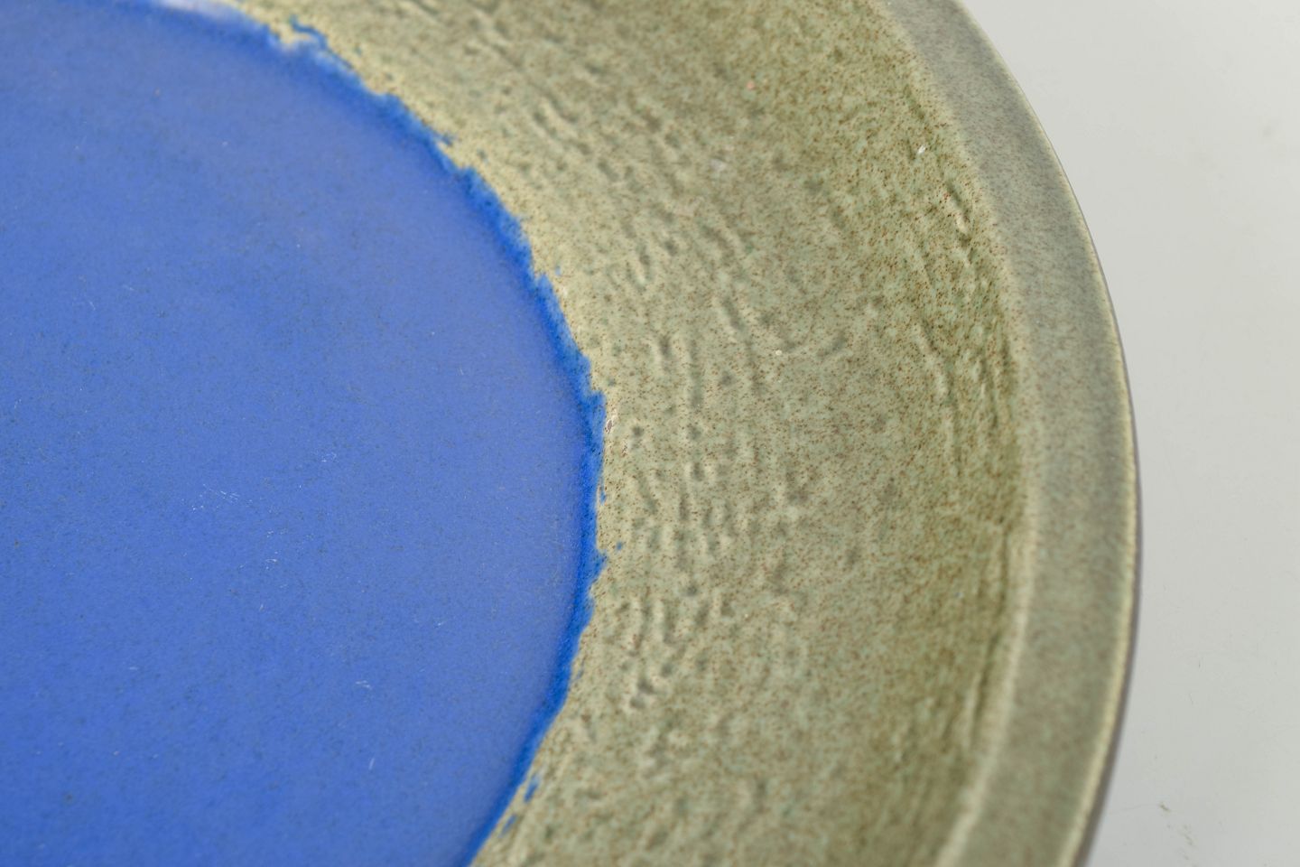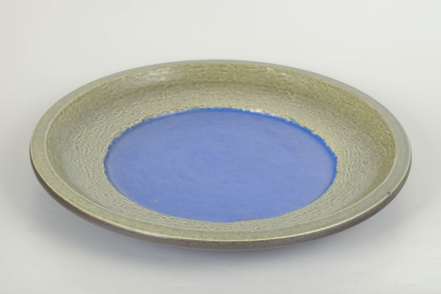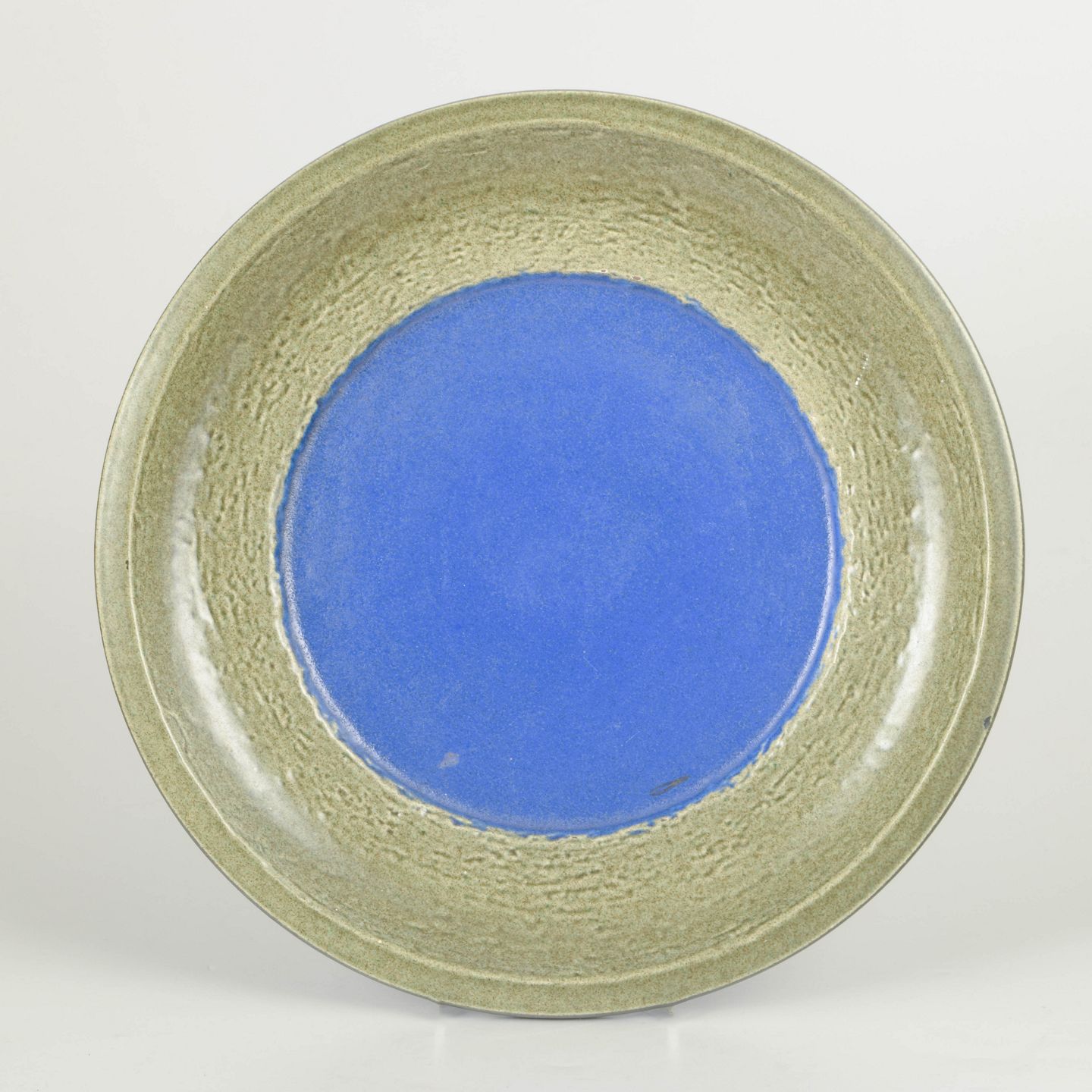 Stort dekorativt fad i stentøj med bred rand i grøn glasur og centralt felt i klar blå tone. Let struktureret overflade med karakteristisk farvekontrast. Model 6001M.
