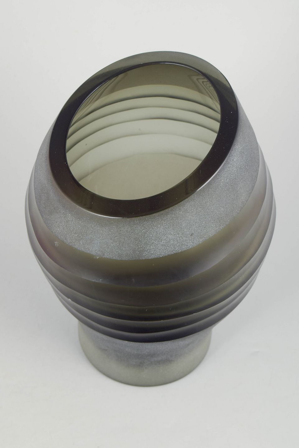 Skulpturel mundblæst glasvase med matteret overflade og lagdelte horisontale bånd i røggrønne og grå nuancer. Elegant organisk form med karakteristisk venetiansk glasbearbejdning.