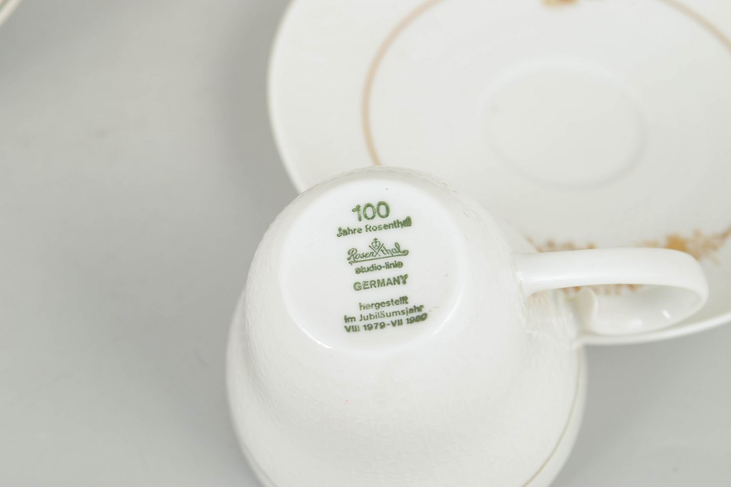 Sæt bestående af fire kaffekopper med tilhørende underkopper i porcelæn dekoreret med det karakteristiske blomsterornament fra Romanze-serien. Dekorationen fremstår i gyldne nuancer med fine detaljer og et elegant, romantisk udtryk, typisk for Wiinblads formsprog i 1970’erne.