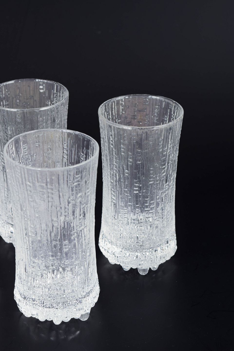 Drikkeglas fra Ultima Thule-serien i klart glas med karakteristisk isstruktur og organisk form, inspireret af smeltende is i nordisk natur, designet i 1970’erne.