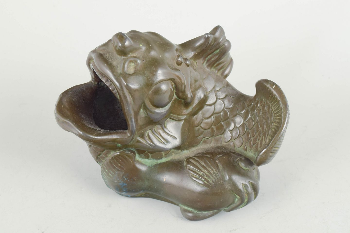 Skulpturel fiskefigur i diskometal med markant stiliseret formsprog og dekorativ overflade. Model 1518.