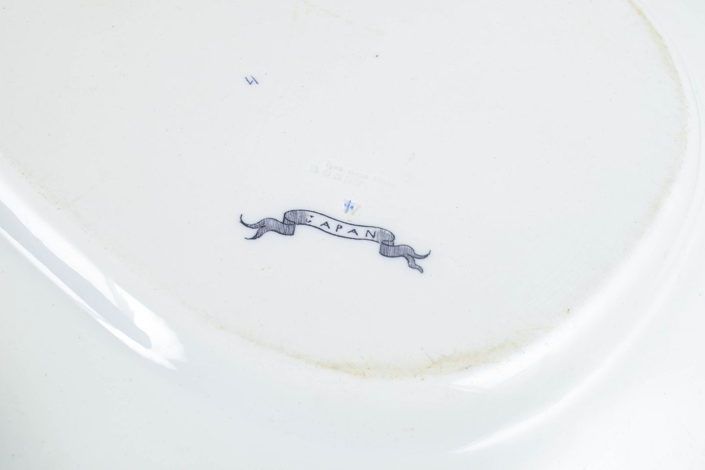 Store serveringsfade i fajance med orientalsk inspireret dekoration i polykrome farver og detaljerig bemaling i japansk stil, karakteristisk for Rörstrands japanismeproduktion fra begyndelsen af 1900-tallet.