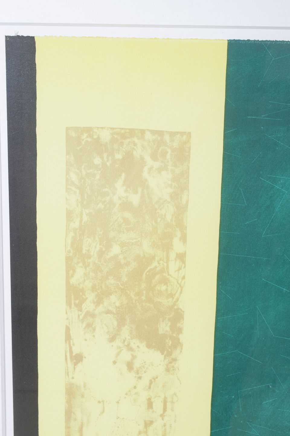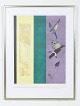 Abstrakt komposition med vertikale farvefelter og svævende organiske former, udført som farvelitografi, signeret og nummereret 19/150, dateret 1995.