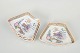 Dekorative firkantede fade i fajance med polykrom dekoration i orientalistisk japansk stil med pagodemotiv, fugl og blomster. Model Japan, produceret i perioden 1866–1925 og dateret til 1880’erne.
