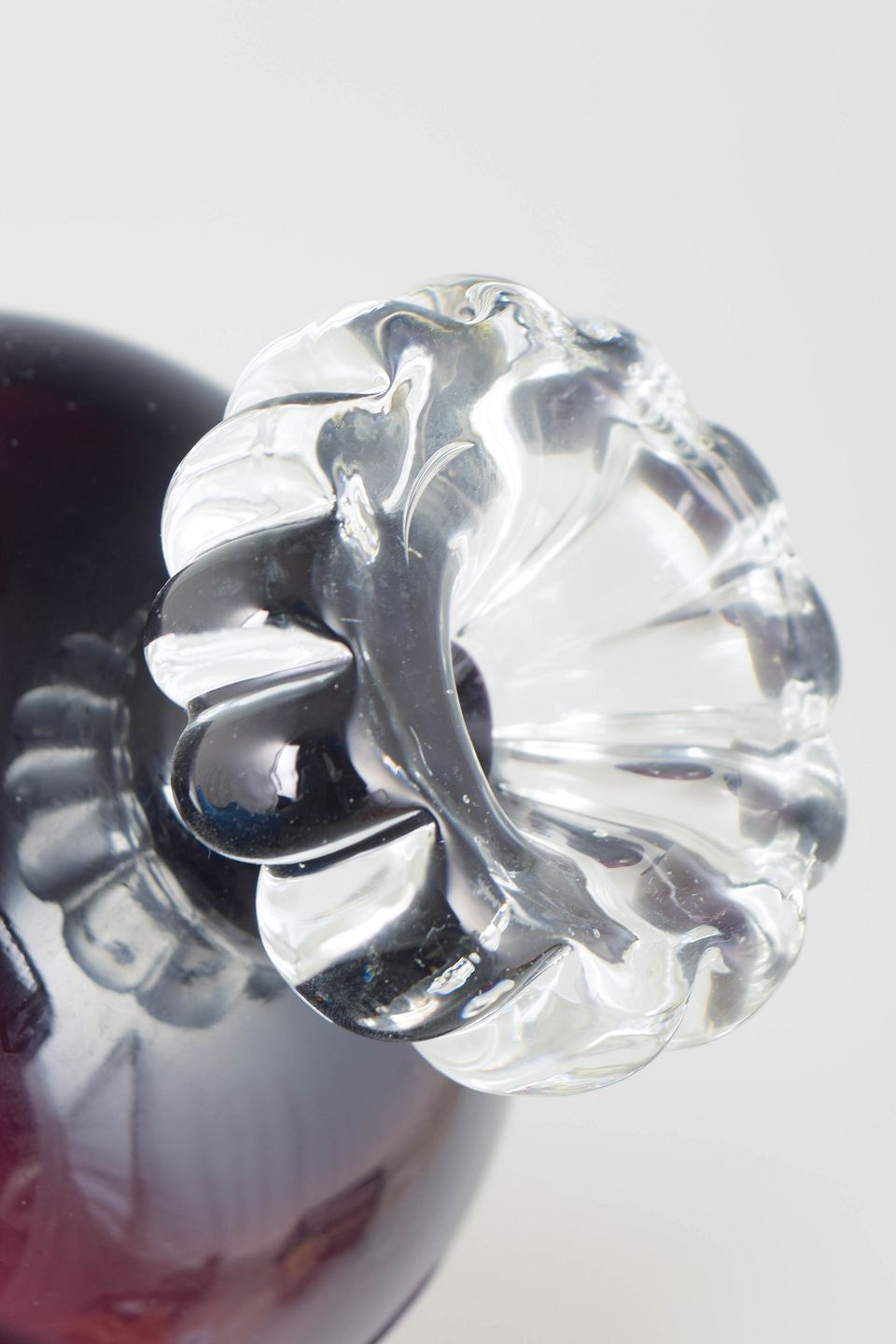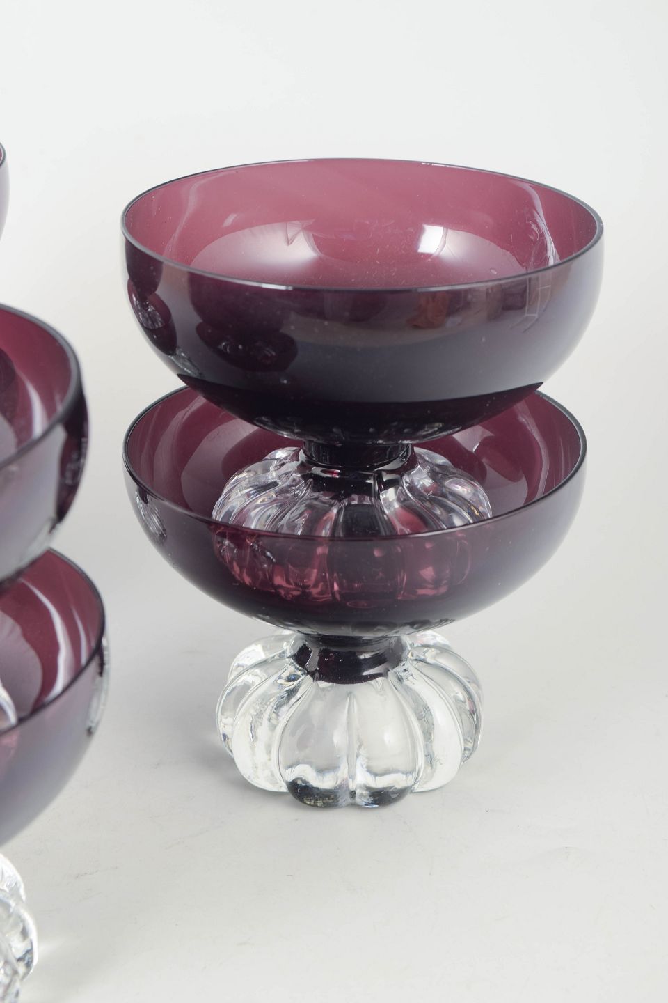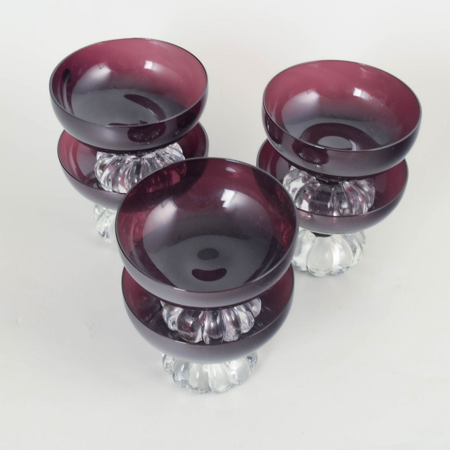 Elegante dessertskåle i mundblæst glas med dyb ametystfarvet kumme og dekorativ fod i klart glas med rillet struktur, karakteristisk for svensk glasdesign fra perioden.
