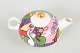 Tekande i porcelæn med låg, mærket Picasso. Rundet form med farverig dekor i stærke kontraster samt guldkant på knop og tud, typisk for sen 1900-tals produktion.
