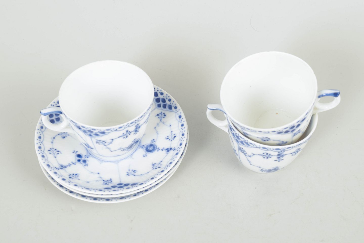 Håndmalet porcelæn i musselmalet halvblonde dekoration, model 1/719, første sortering. Kopper med tilhørende underkopper i klassisk riflet form.