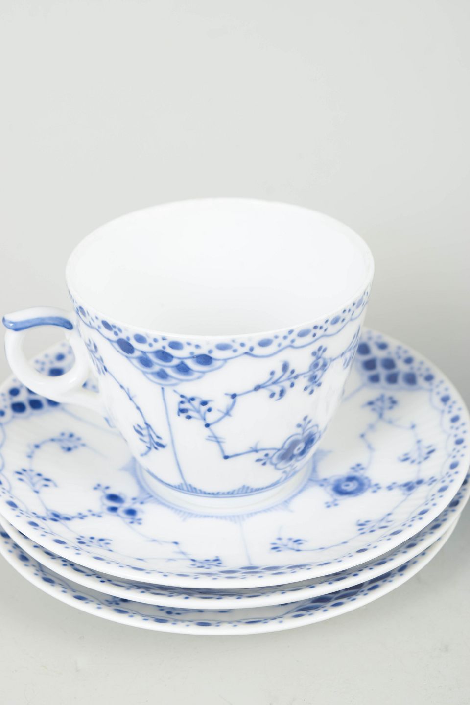 Royal Copenhagen Musselmalet Halvblonde, sæt af tre kaffekopper med underkopper.