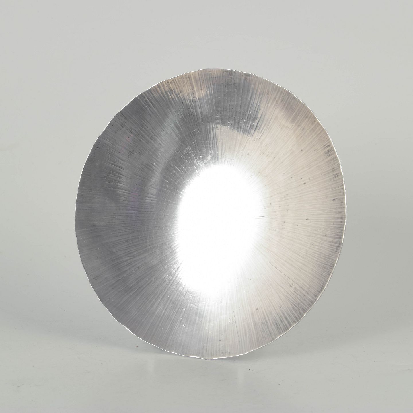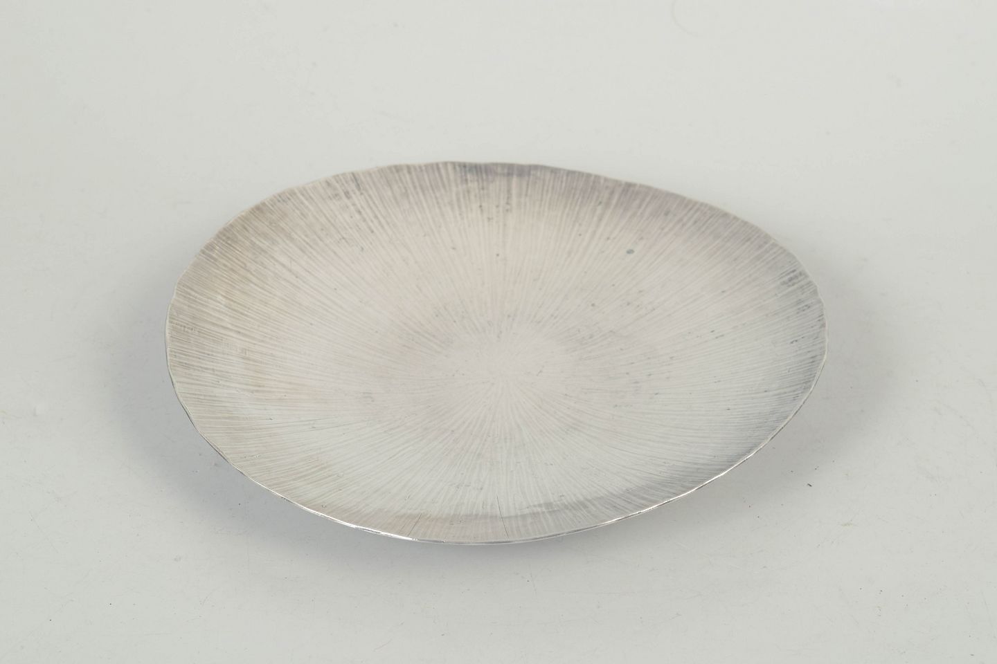 Circular bowl in sterling silver with a distinctive hand hammered surface and radial pattern, model from 1989, signed.