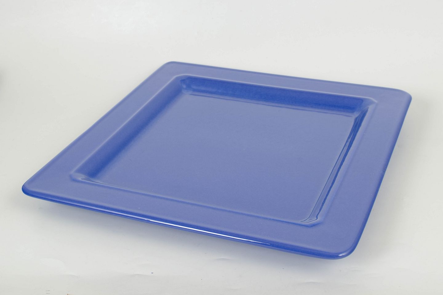 Enkelt og elegant sæt i keramik bestående af tre store firkantede tallerkner med ensartet dyb blå glasur.