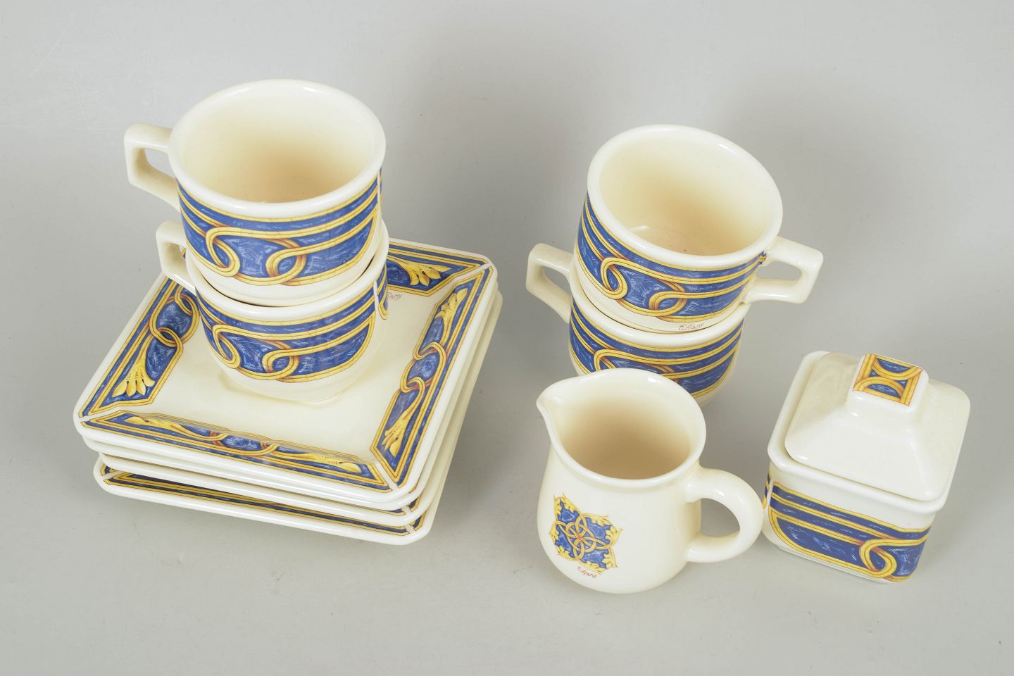 Dekorativt kaffesæt i keramik bestående af fire kaffekopper med tilhørende underkopper samt sukkerskål og flødekande, dekoreret i blå, gule og gyldne toner med ornamentale mønstre.