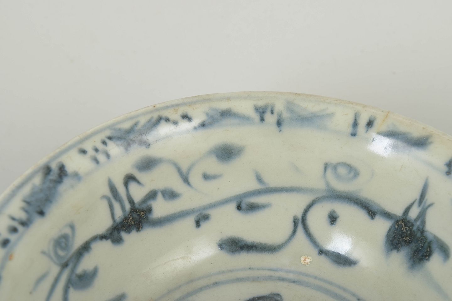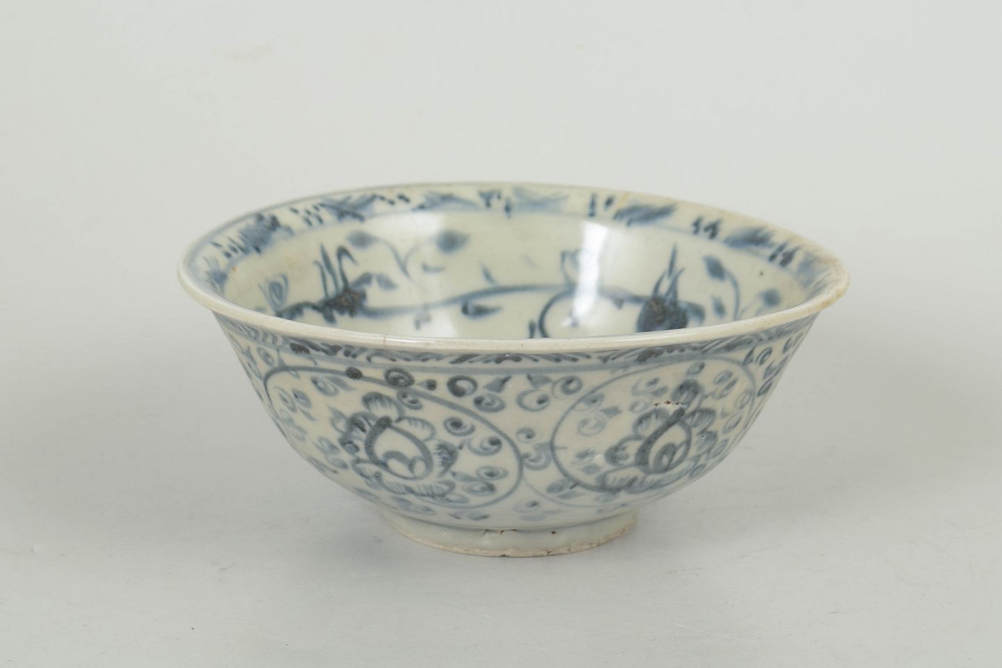 Hånddrejet porcelænsskål med detaljeret blå underglasurdekoration, udført med ornamentale og stiliserede motiver typiske for perioden.