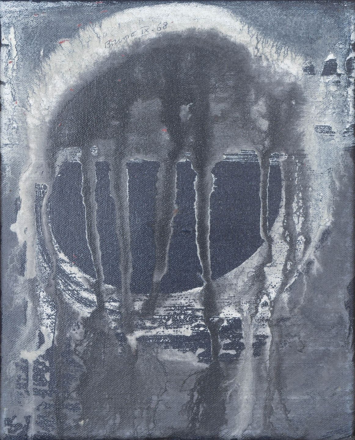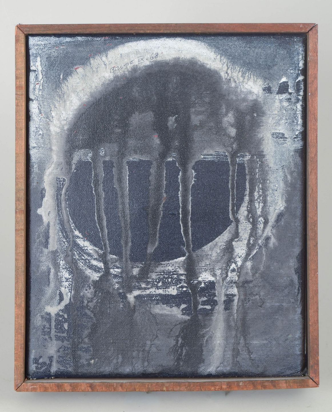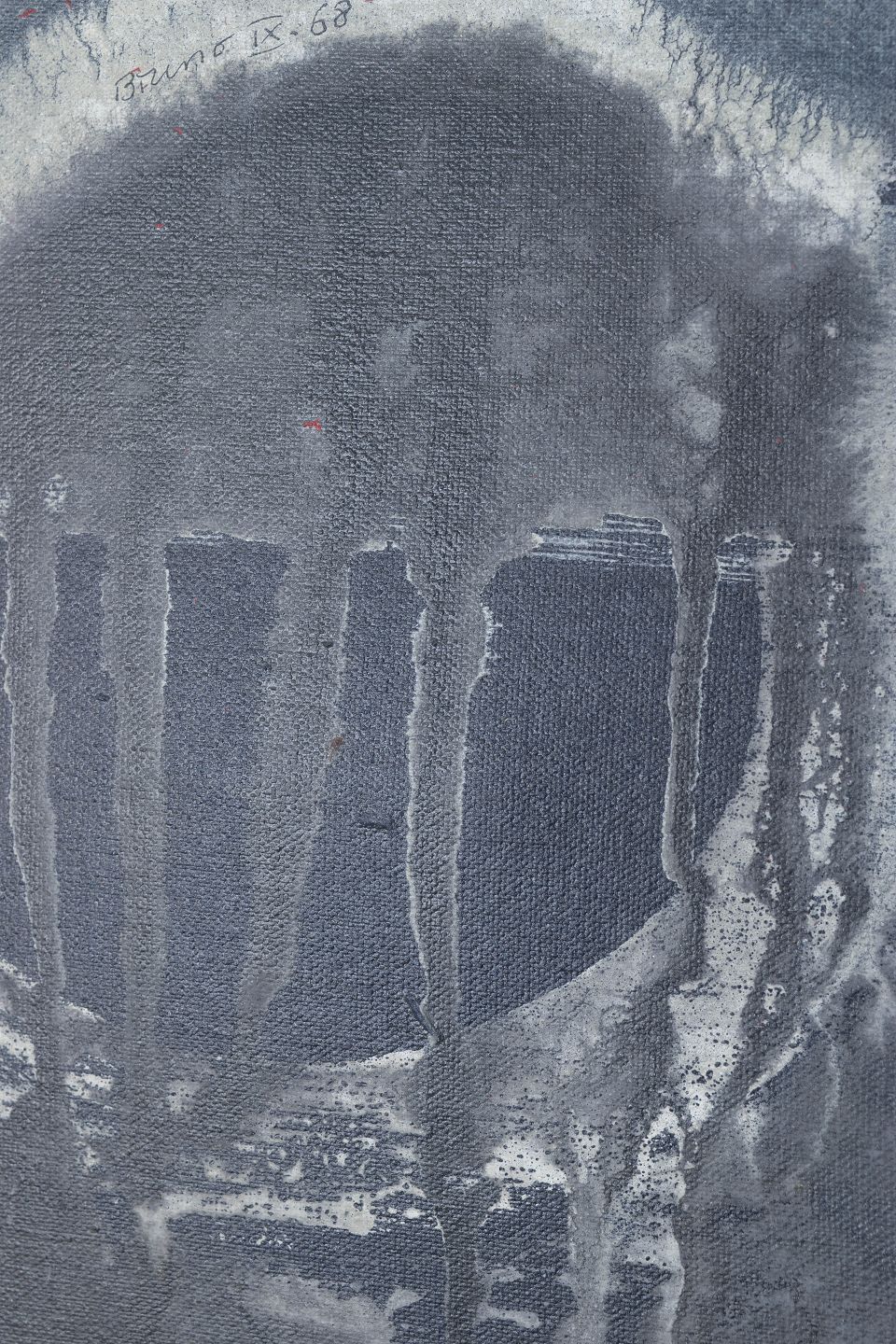 Abstrakt komposition med cirkulært motiv og dryppende, teksturelle lag udført i olie på lærred, signeret Bruno 68.