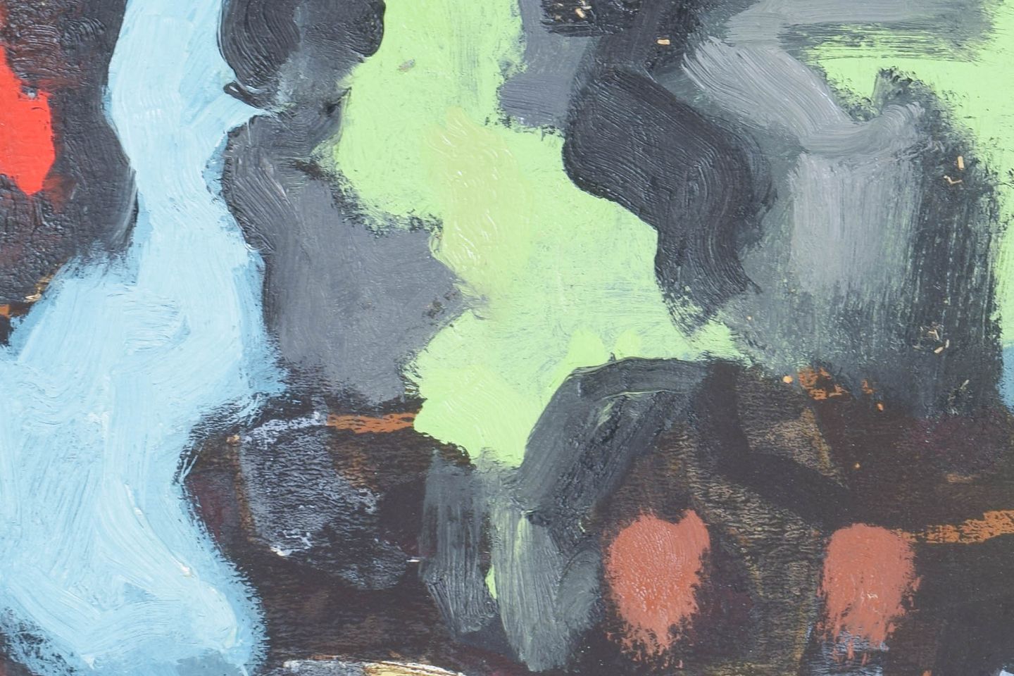 Abstrakt komposition med organiske og geometriske former i dæmpede og kontrasterende farvefelter udført i olie på plade, usigneret.