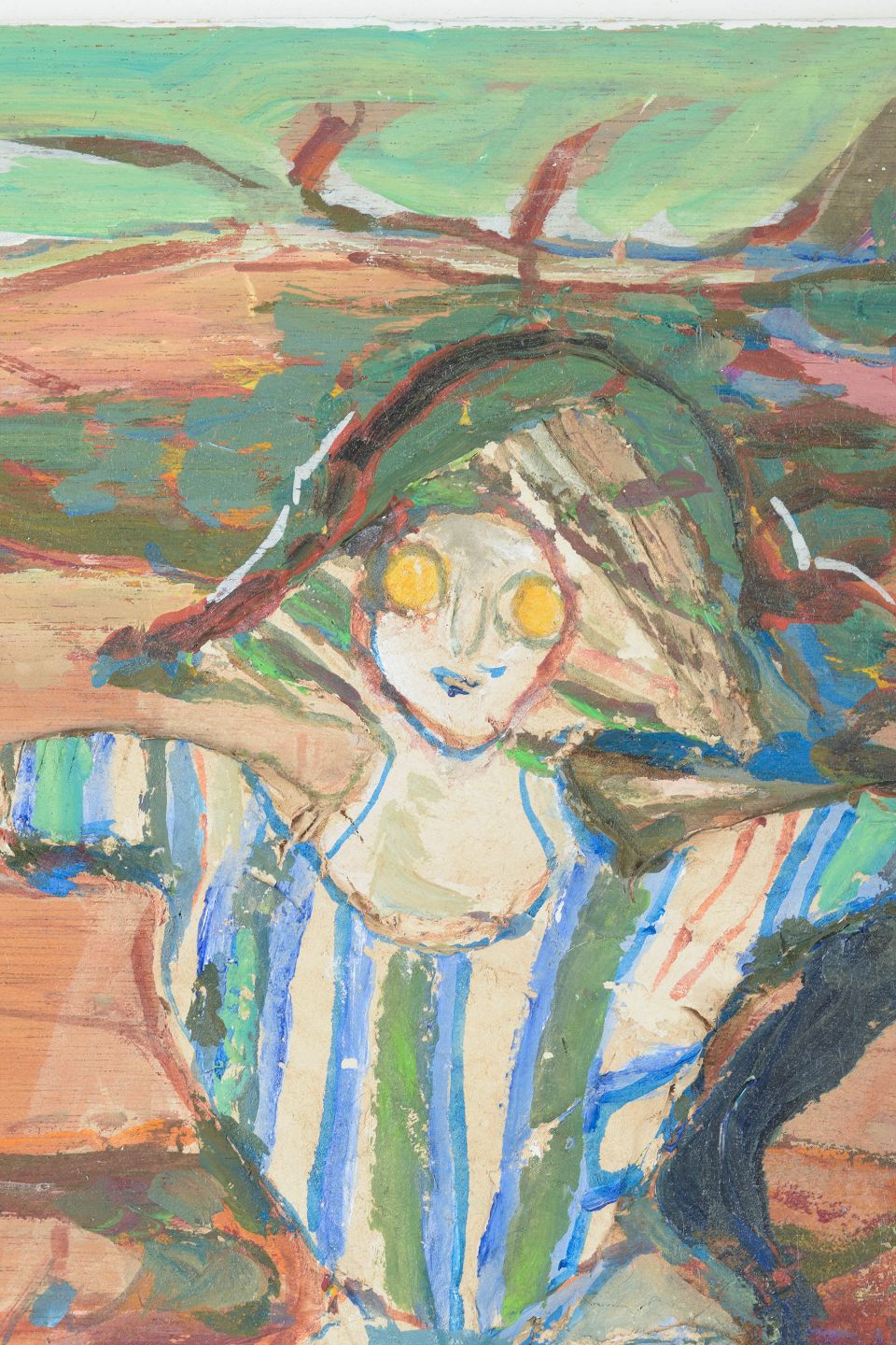 Ekspressivt figurativt motiv med bevægelse og levende farveføring udført i mixed media på plade, signeret.
