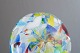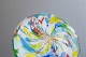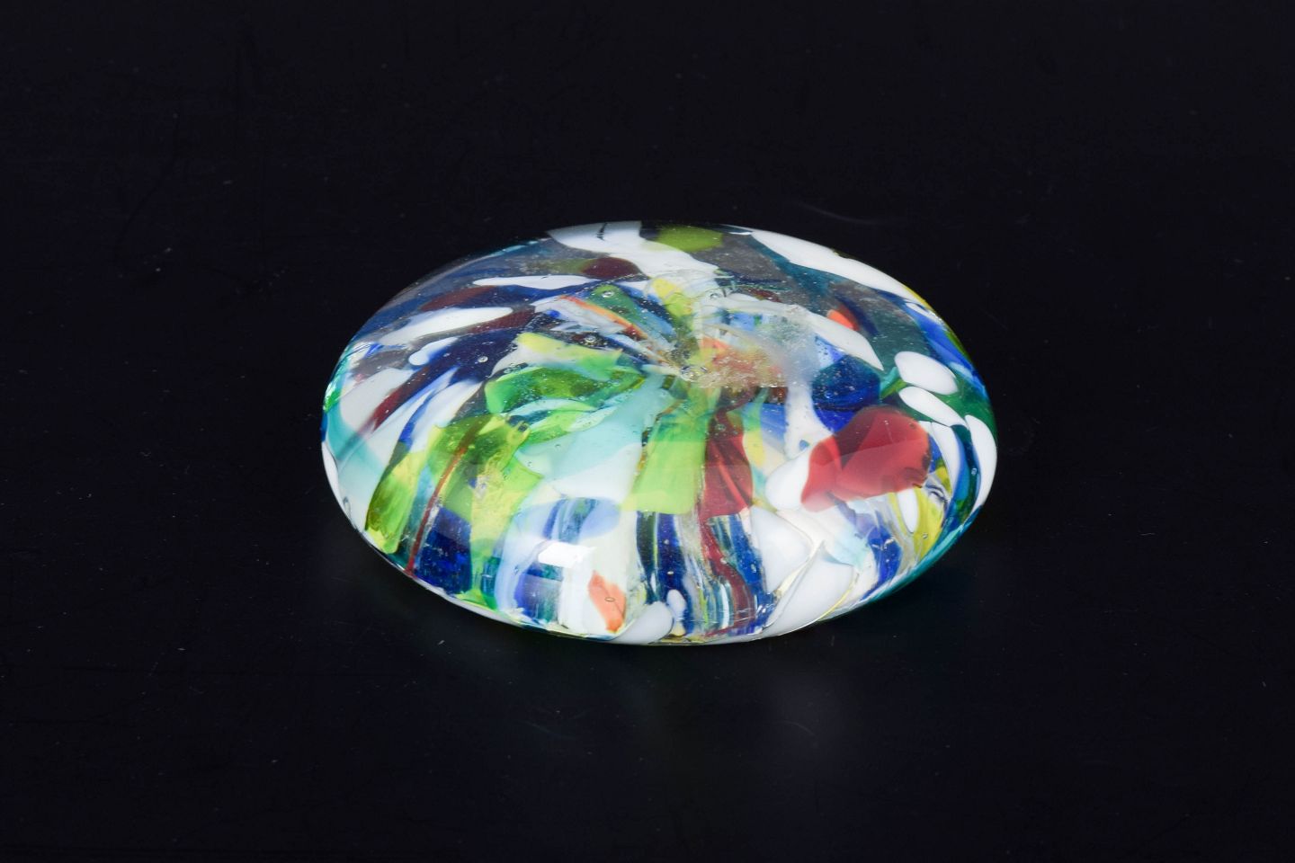 Lav, rund brevpresser i klart glas med indsmeltede millefiori dekorationer i flerfarvede blomster- og stangmønstre, typisk for venetiansk glaskunst fra Murano.