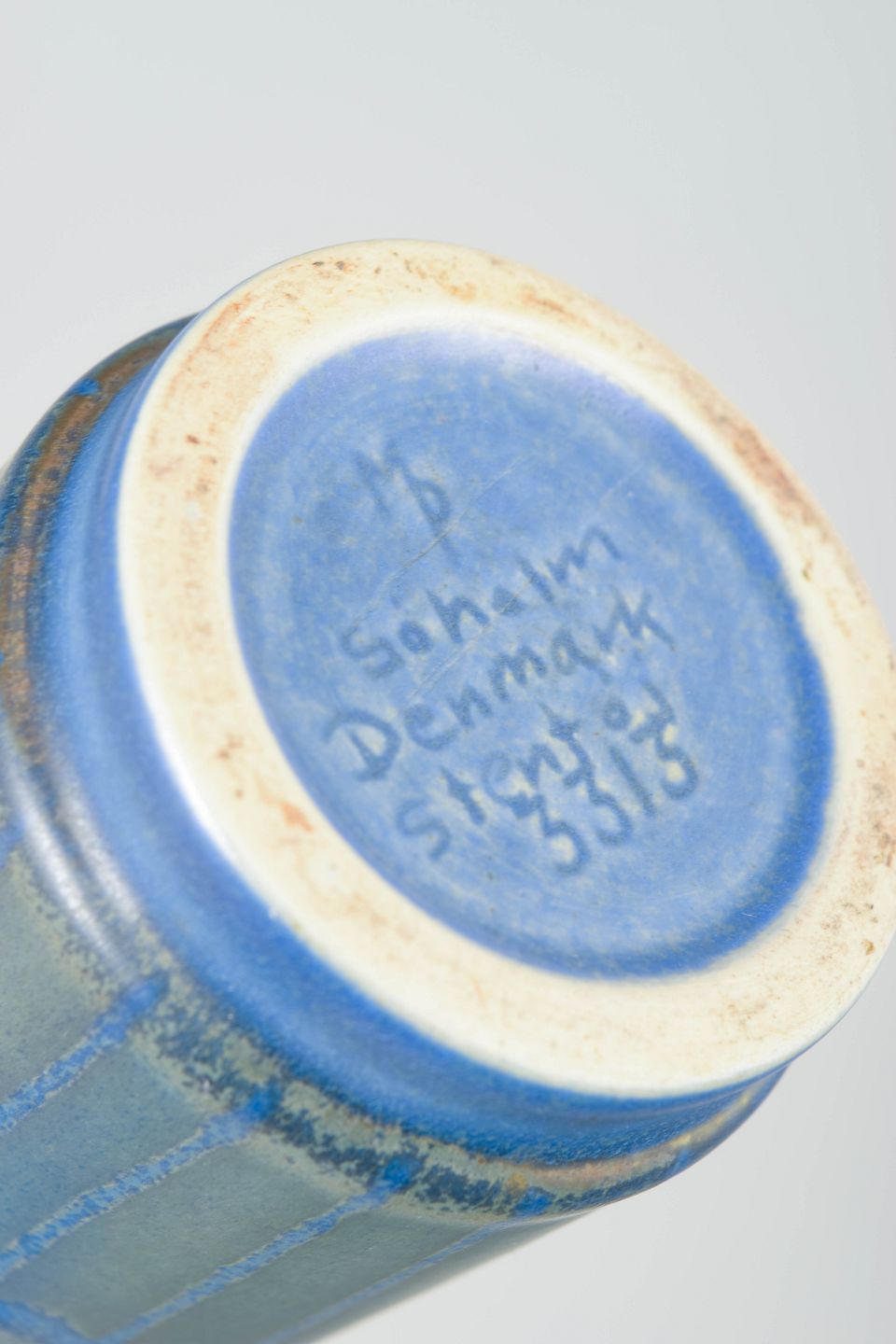 Slank cylinderformet vase i stentøj med lodrette rifler og blå glasur med grønne nuancer og dekorative bånd.