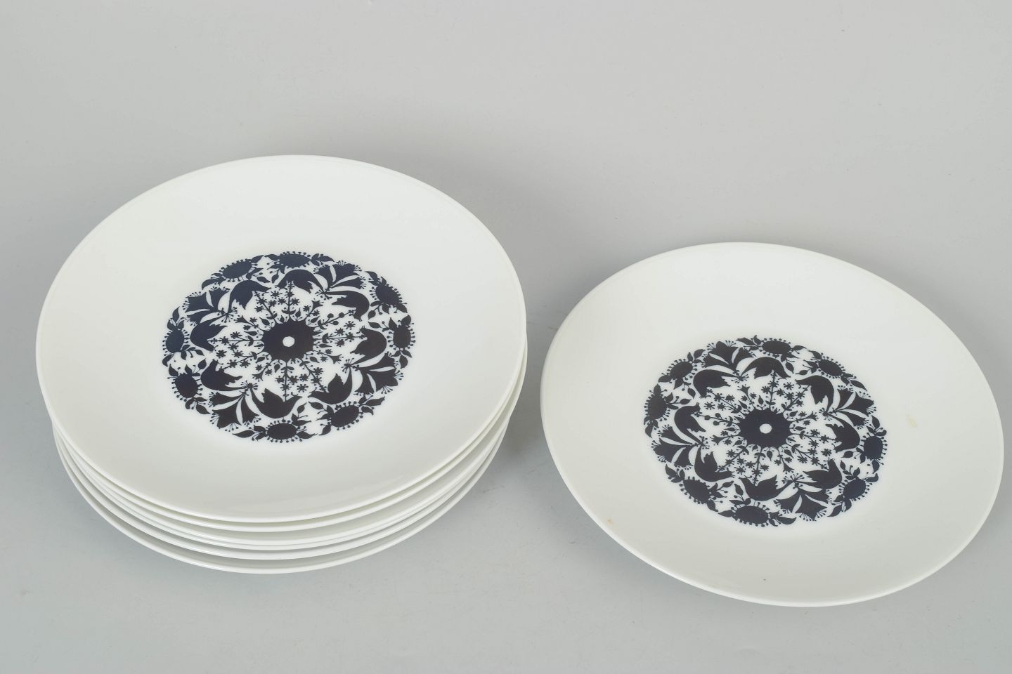 Tallerkener fra Hilton-serien i porcelæn med karakteristisk sort dekoration i midten på hvid bund.