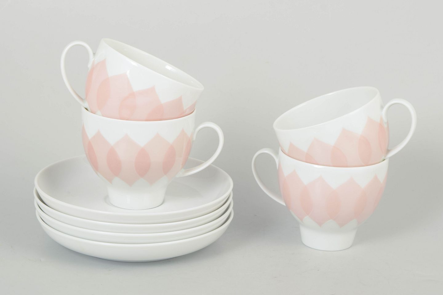 Sæt bestående af fire kaffekopper med matchende underkopper i porcelæn med rosa “Lotus” dekoration, udført med gentaget bladmotiv i bløde nuancer og et karakteristisk dekorativt udtryk.