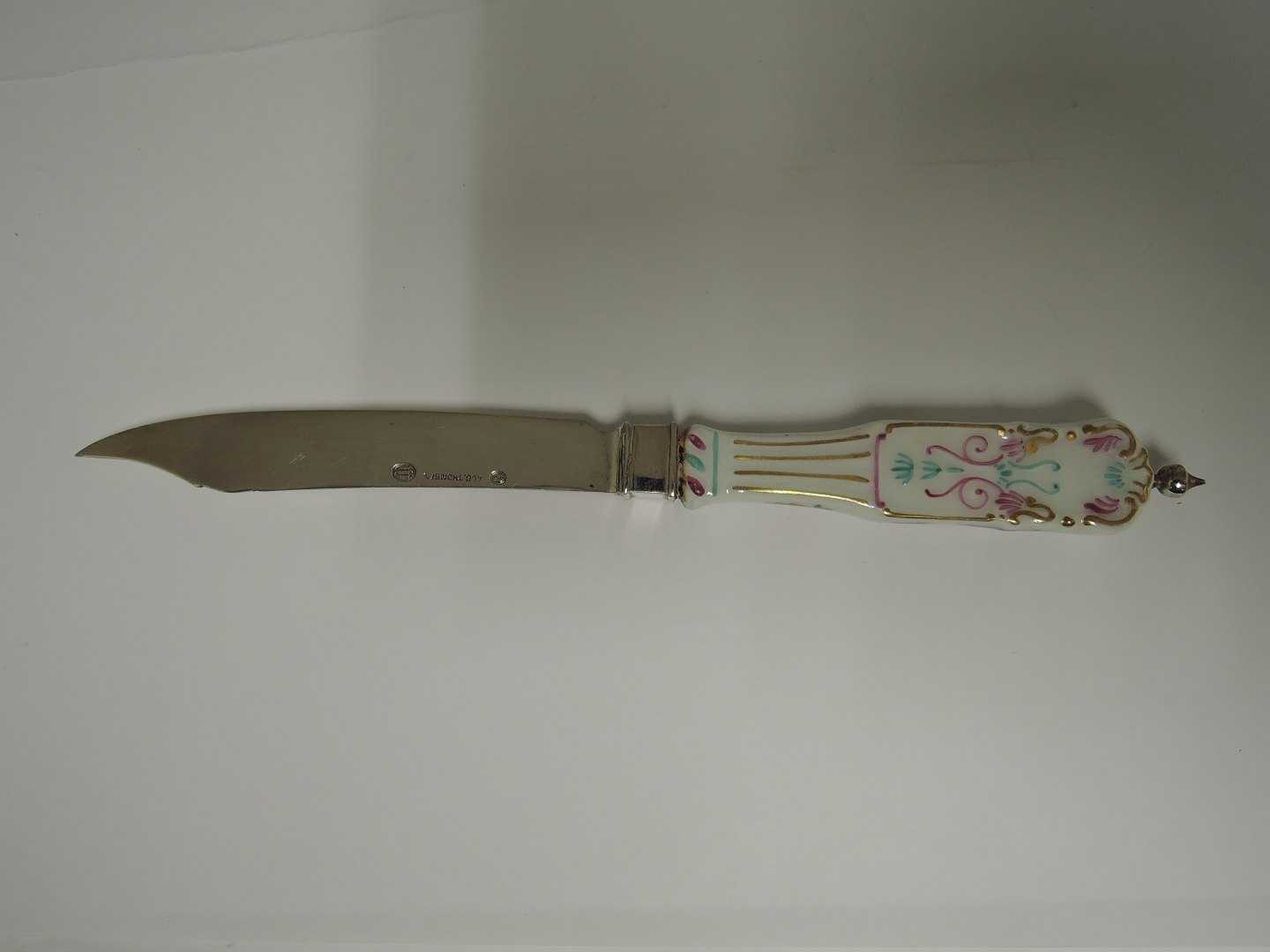 Aug. Thomsen. Sølv (830). 6 frugtknive med porcelænsskafter. Længde 20,5 cm. Produceret 1918