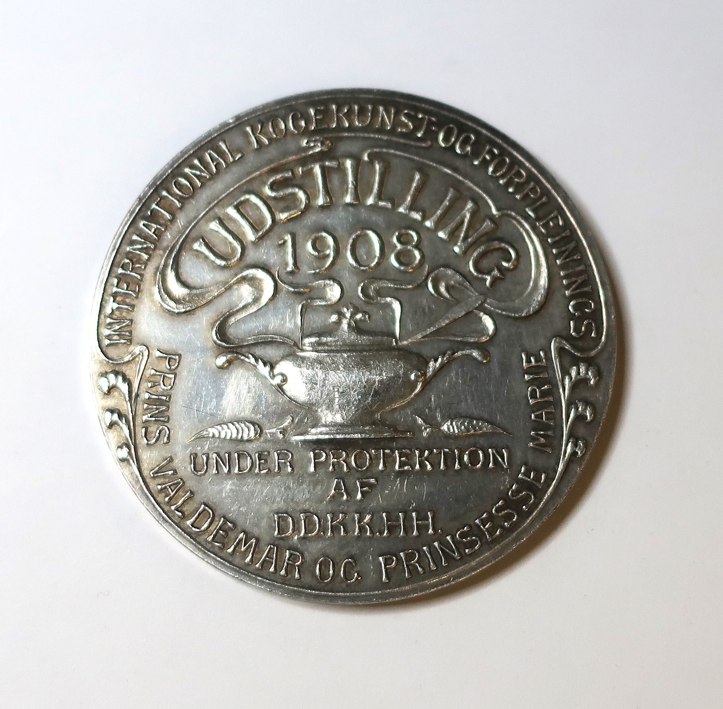 Denmark. Silver medal. Hotel host and restaurateur association Copenhagen. Exhibition 1908. Diameter 45 mm.