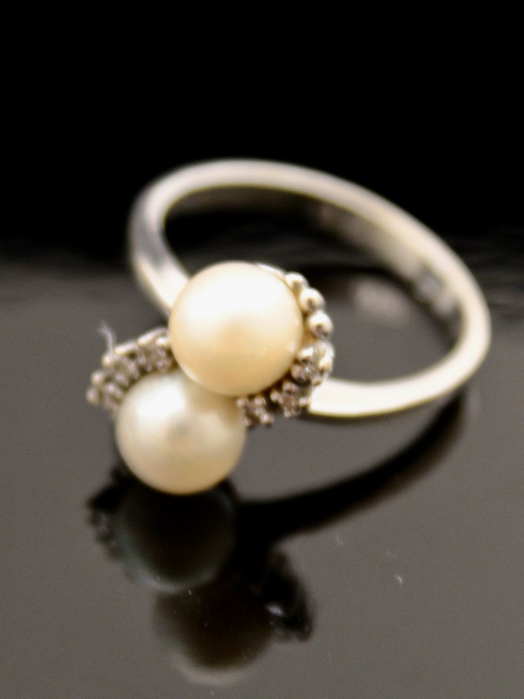 14 karat hvid guld ring størrelse 56 med 6 diamanter og 2 ægte perler fra guldsmed Volmer og Bahner København emne nr. 526614