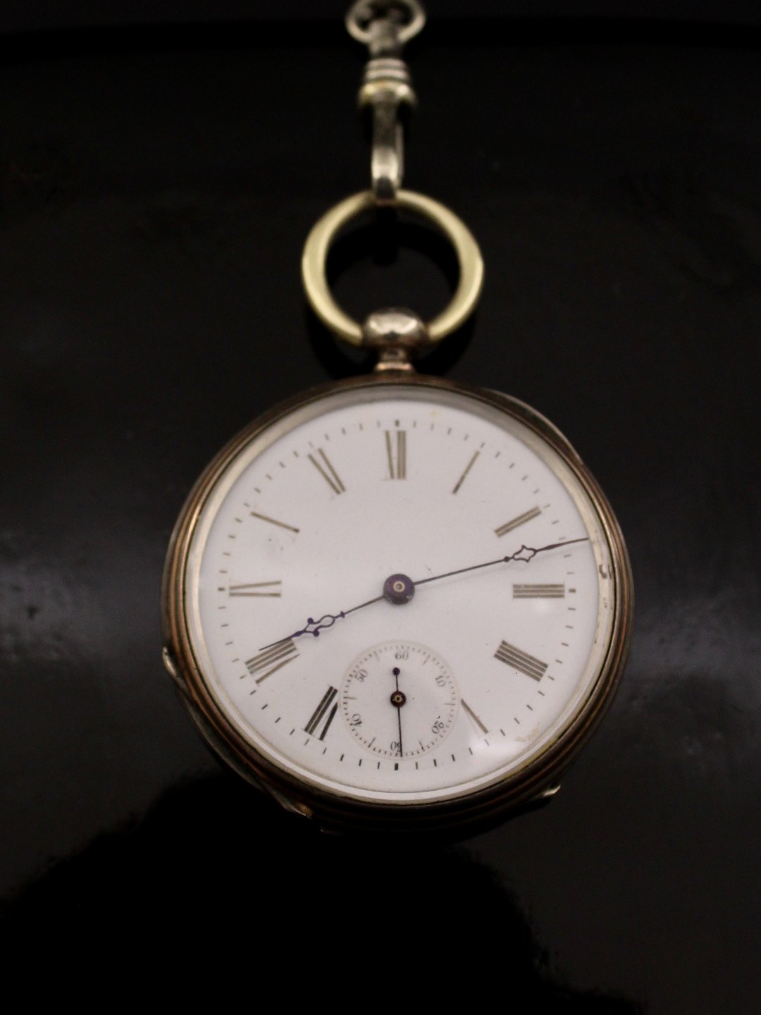 Pocket watch D. 4.6 cm. with key pulls and clock chain 19th century. the watch is running subject no. 593499