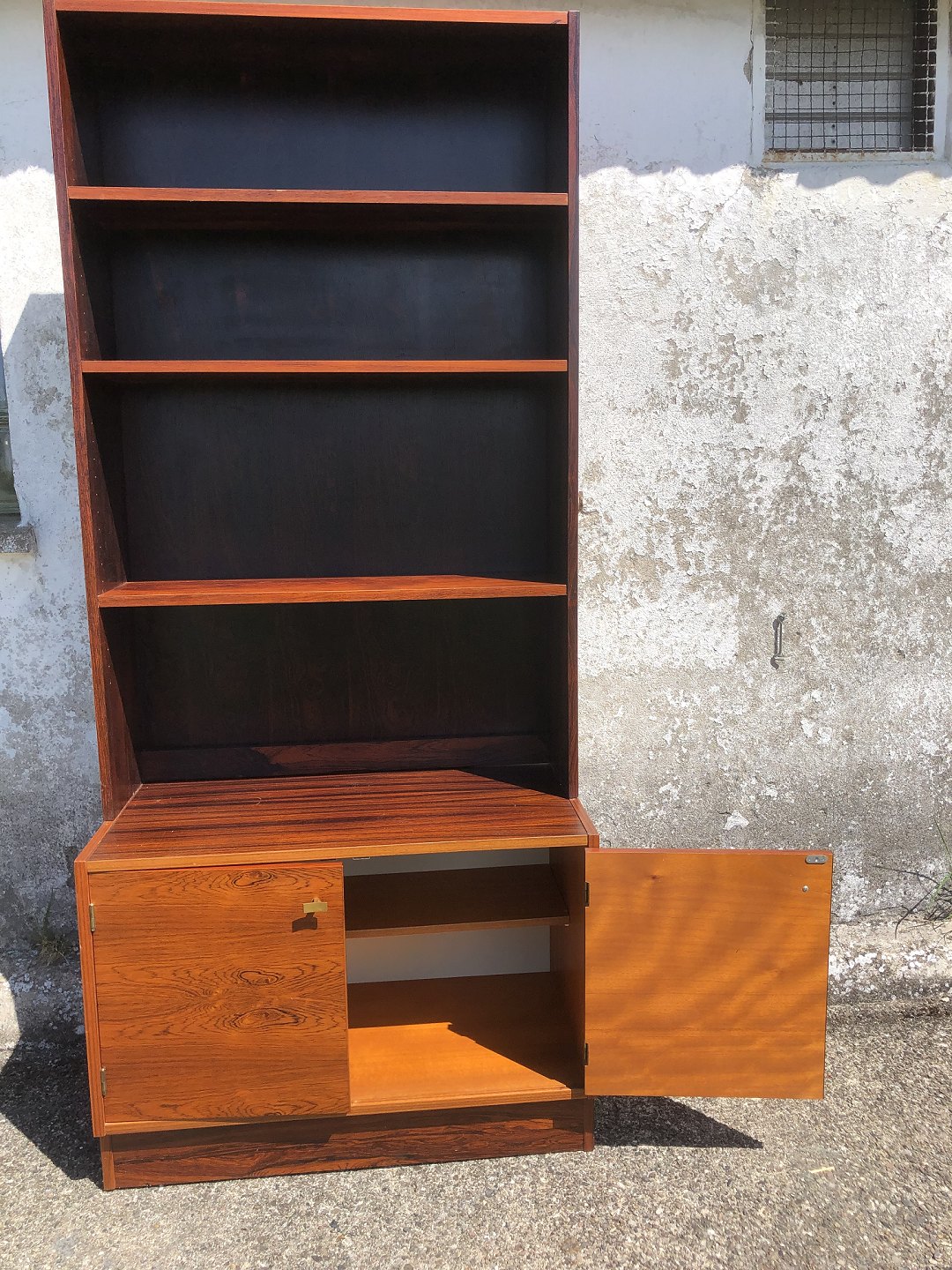 Bookcase with base cabinet in rosewood veneer. Danish modern from the 1960s. The top can be removed. Comes with utility tracks and 1 shelf module with hole for cables. Dimensions HxWxD 194x85x43 cm