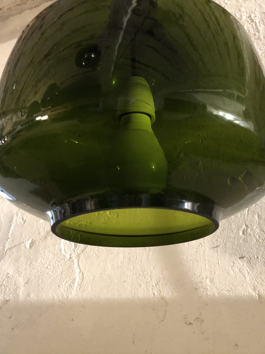 Große grüne Glaslampe aus den 1960er Jahren. Sehr guter Zustand mit Ausnahme sehr kleiner Kratzer am unteren Rand - siehe Foto. Höhe 35 cm, Durchmesser 28 cm.