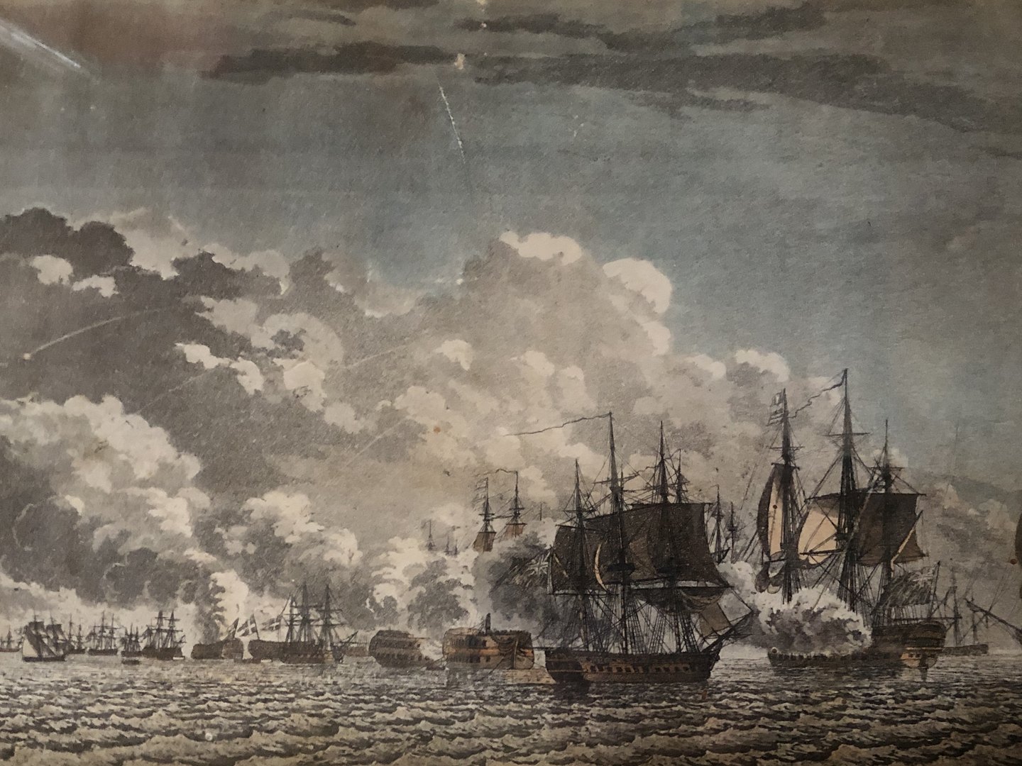 Truslew, Niels (1762-1826), Delvist koloreret kobberstik, Slaget i Kongedybet den 2den April 1801 imellem den Engelske Flaade og den Danske Defensionslinie seet fra Kysten af Amager imellem Batteriet og Kastrup, Mål med ramme: 50x40 cm, ramme og tryk med nogle aldersrelaterede spor (se foto)